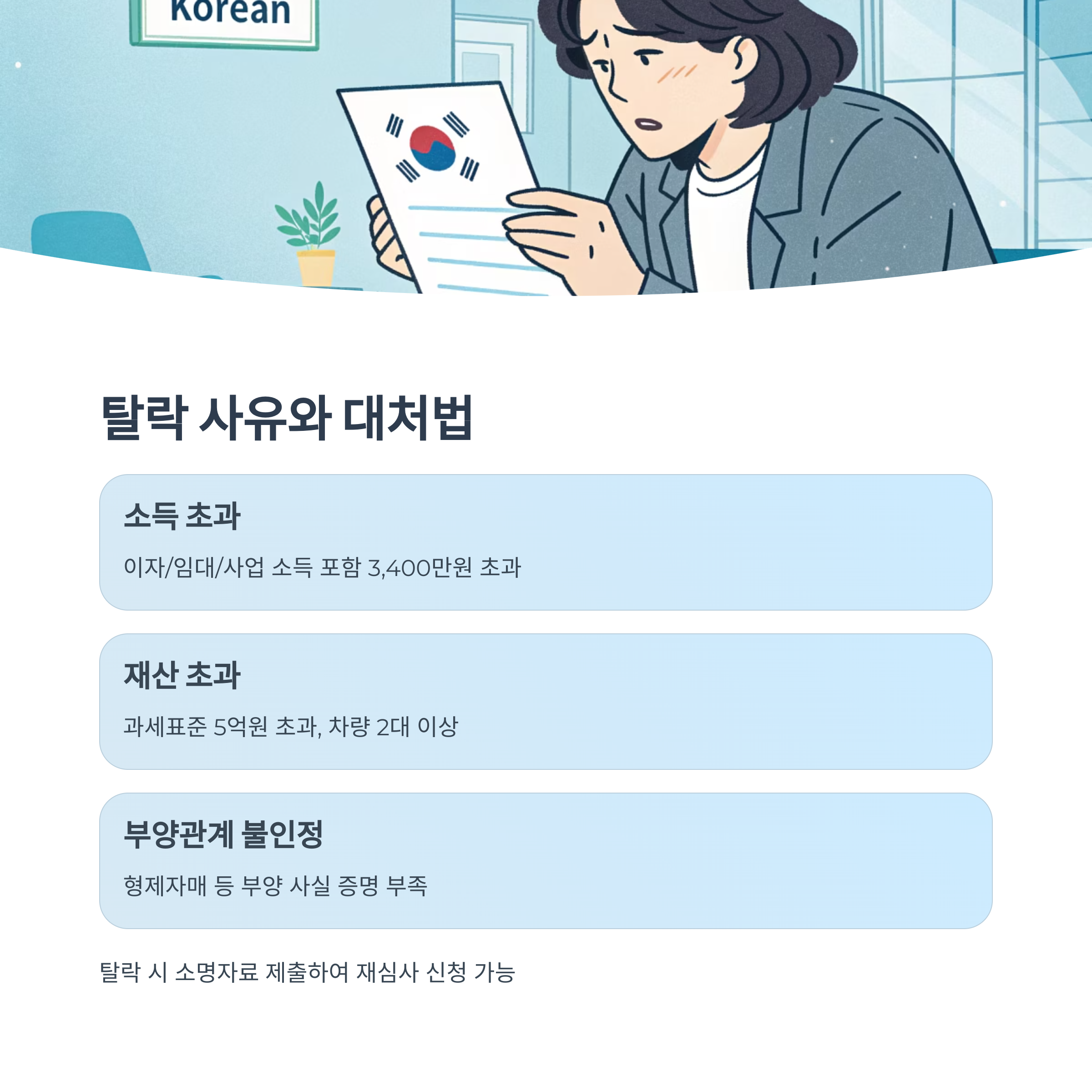 | 부양관계 불인정 | 송금·동거 증명 부족 | 부양확인서, 의료비 영수증 제출 |