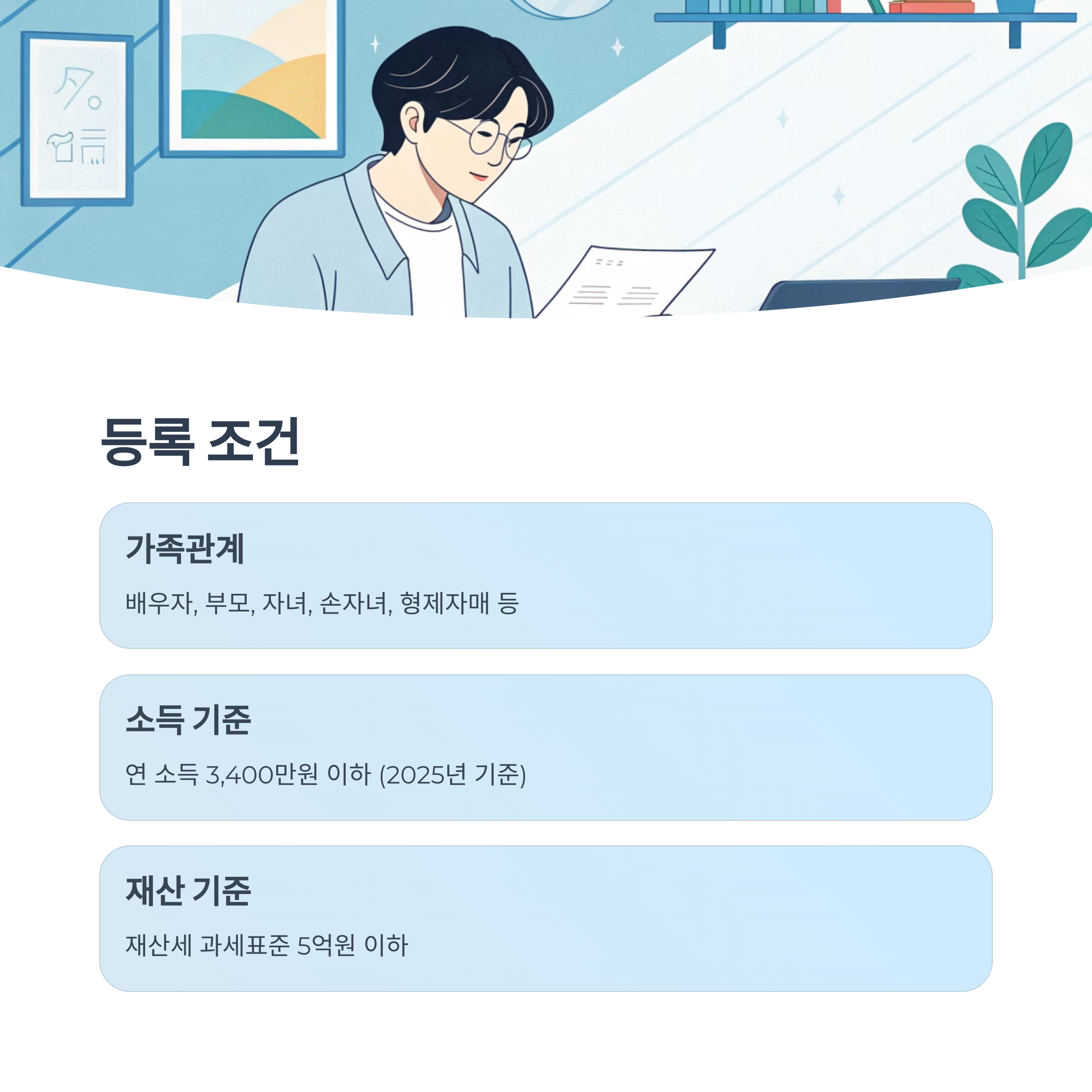 건강보험 피부양자로 등록하기 위해서는 크게 두 가지 조건을 만족해야 해요. 첫 번째는 직장가입자와의 관계, 두 번째는 소득 및 재산 기준이에요. 가족이라는 이유만으로 무조건 등록되는 것은 아니라는 점 꼭 기억해 주세요.