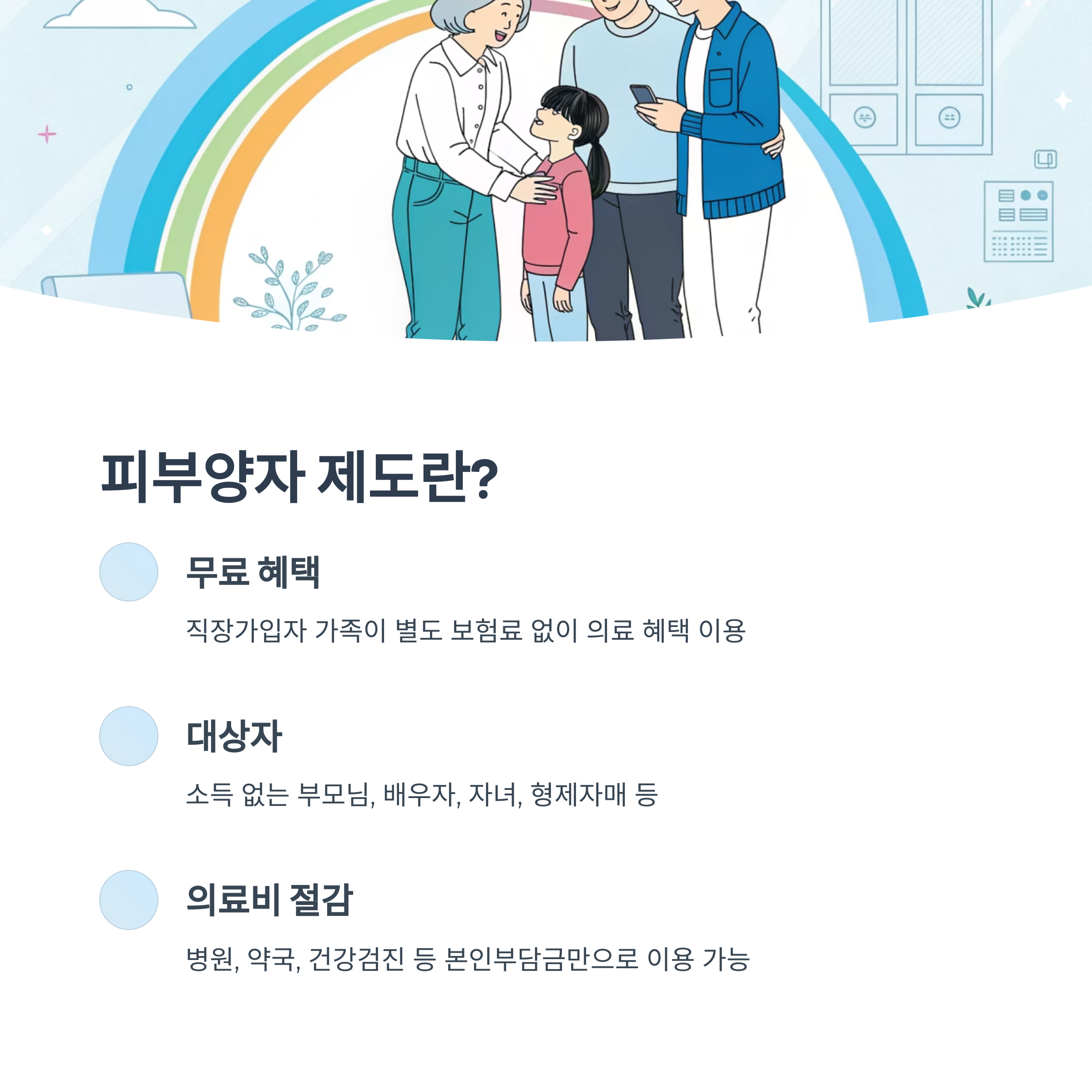 피부양자란 건강보험 직장가입자의 가족 중 일정 요건을 충족하여 별도의 보험료를 내지 않고 보험 혜택을 받을 수 있는 사람을 말해요. 쉽게 말해, 보험료는 직장가입자가 부담하고, 피부양자는 그 혜택을 함께 누리는 구조인 거죠.