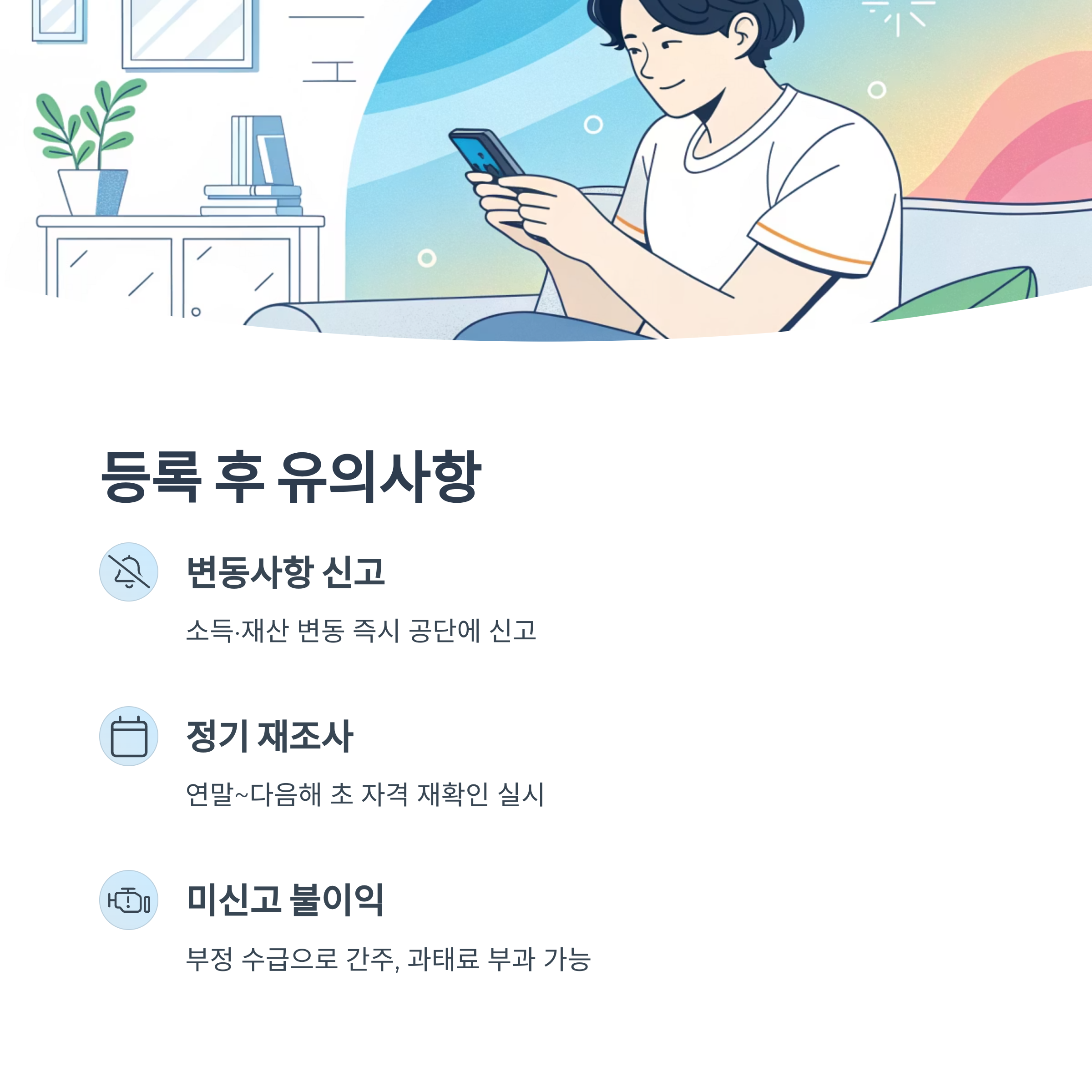 가장 중요한 건 소득·재산 변동 시 신고예요. 피부양자였던 가족이 갑자기 취업하거나, 연금 수령이 시작되거나, 상속 등으로 재산이 증가하면 즉시 공단에 알려야 해요. 이를 알리지 않으면 부정 수급으로 간주될 수 있어요.