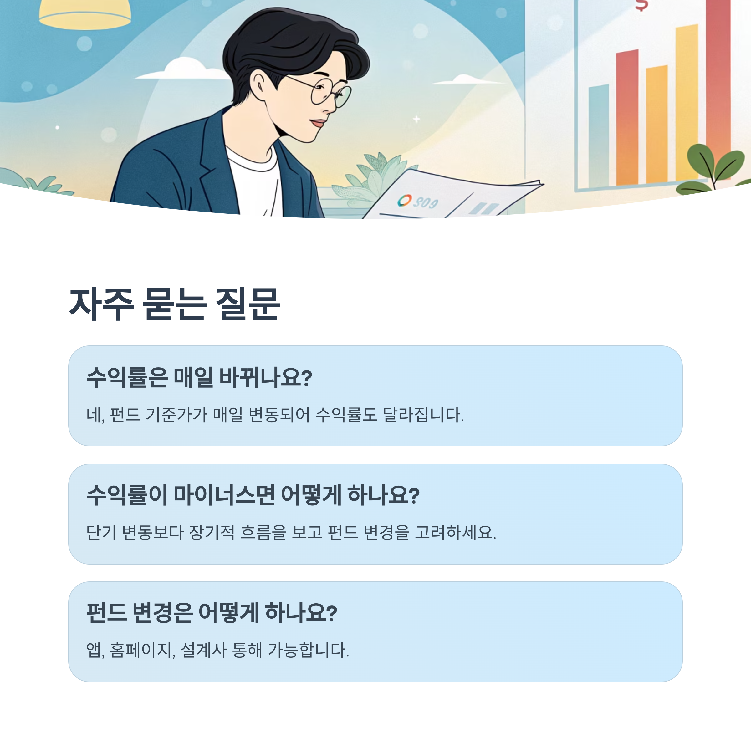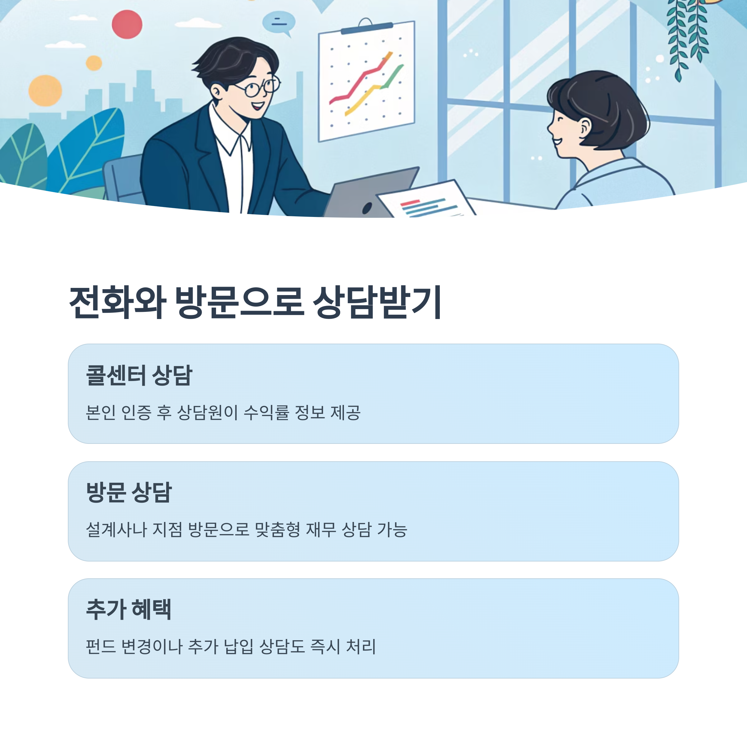방문 상담의 장점은 수익률 확인뿐만 아니라 향후 투자 전략까지 함께 수립할 수 있다는 거예요. 펀드 변경이나 추가 납입 상담도 직접 받으며 즉시 처리할 수 있어요.
