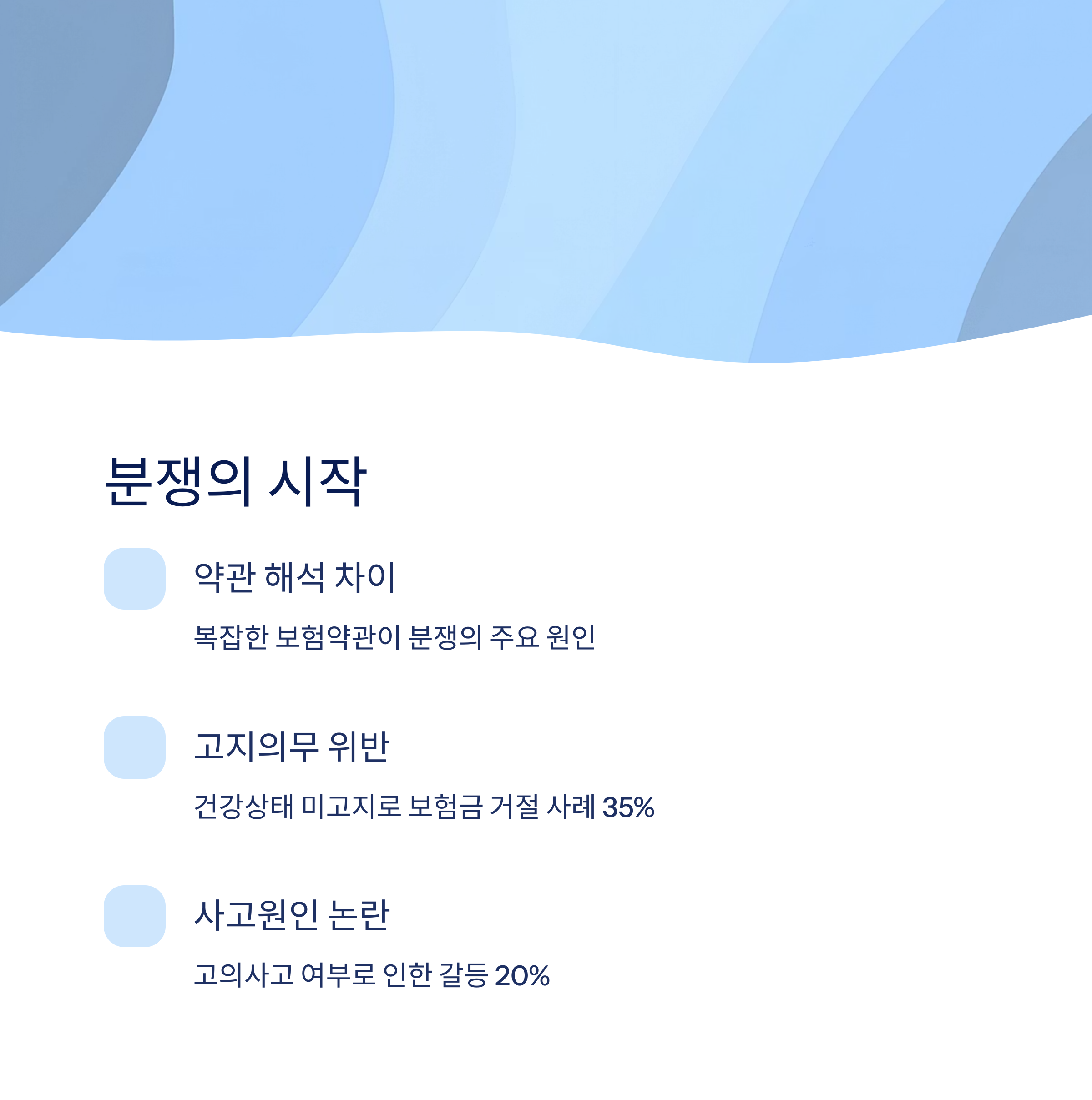 | 고지의무 위반 | 기존 질환이나 사실을 누락함 | 약 35% |