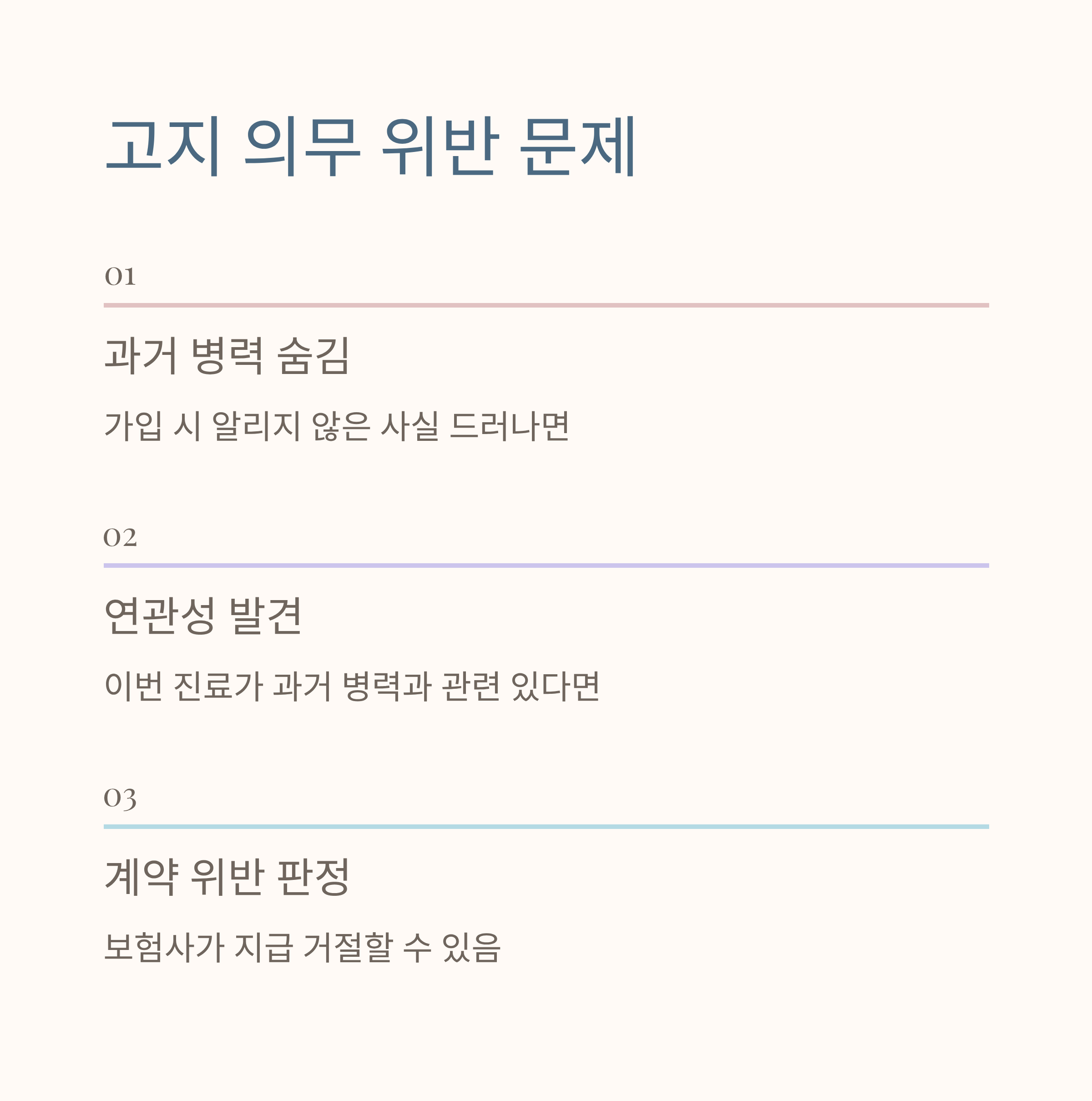 보험 가입 당시 알리지 않은 병력이나 사실이 나중에 드러나면 청구가 거절될 수 있어요. 예를 들어 과거 병력을 숨기고 가입했는데, 이번 진료가 그와 연관 있다면 문제가 돼요. 보험사는 이를 계약 위반으로 보고 지급을 거절할 수 있답니다.