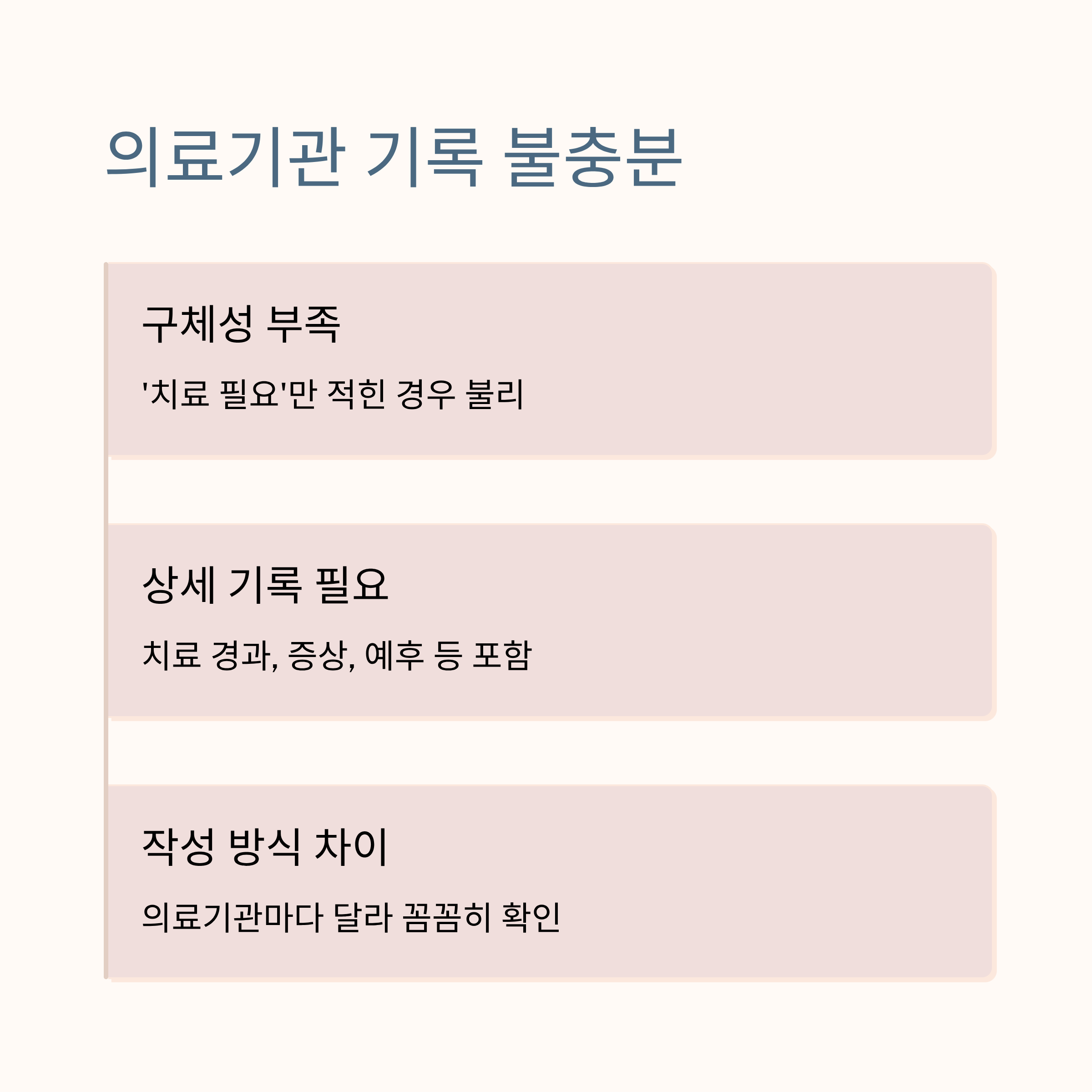 진단서나 소견서가 구체적이지 않으면 보험금 심사에서 불리하게 작용해요. 예를 들어 단순히 ‘치료 필요’라고만 적힌 경우보다는 치료 경과, 증상, 예후 등이 상세히 기록돼야 신뢰성을 높일 수 있어요.