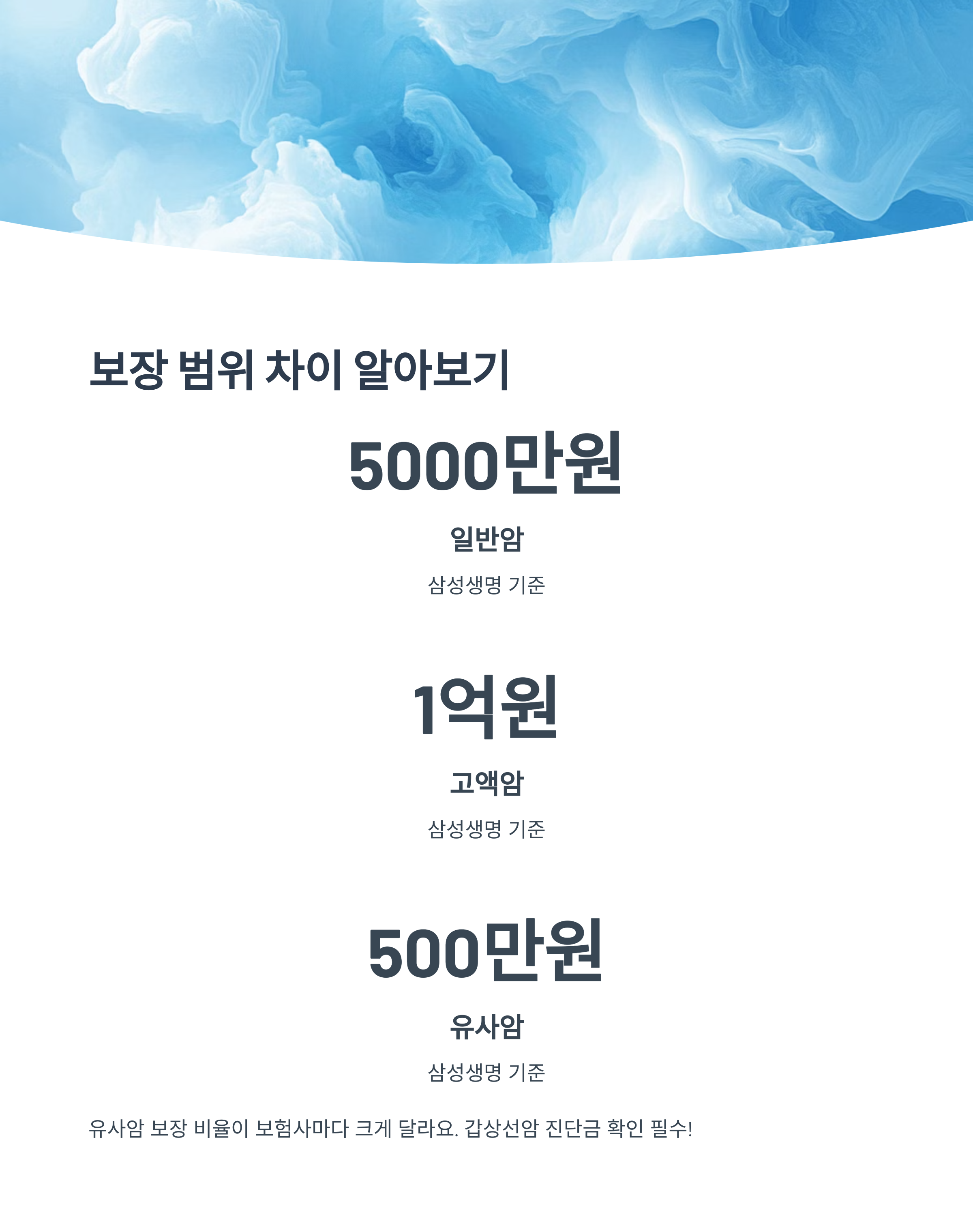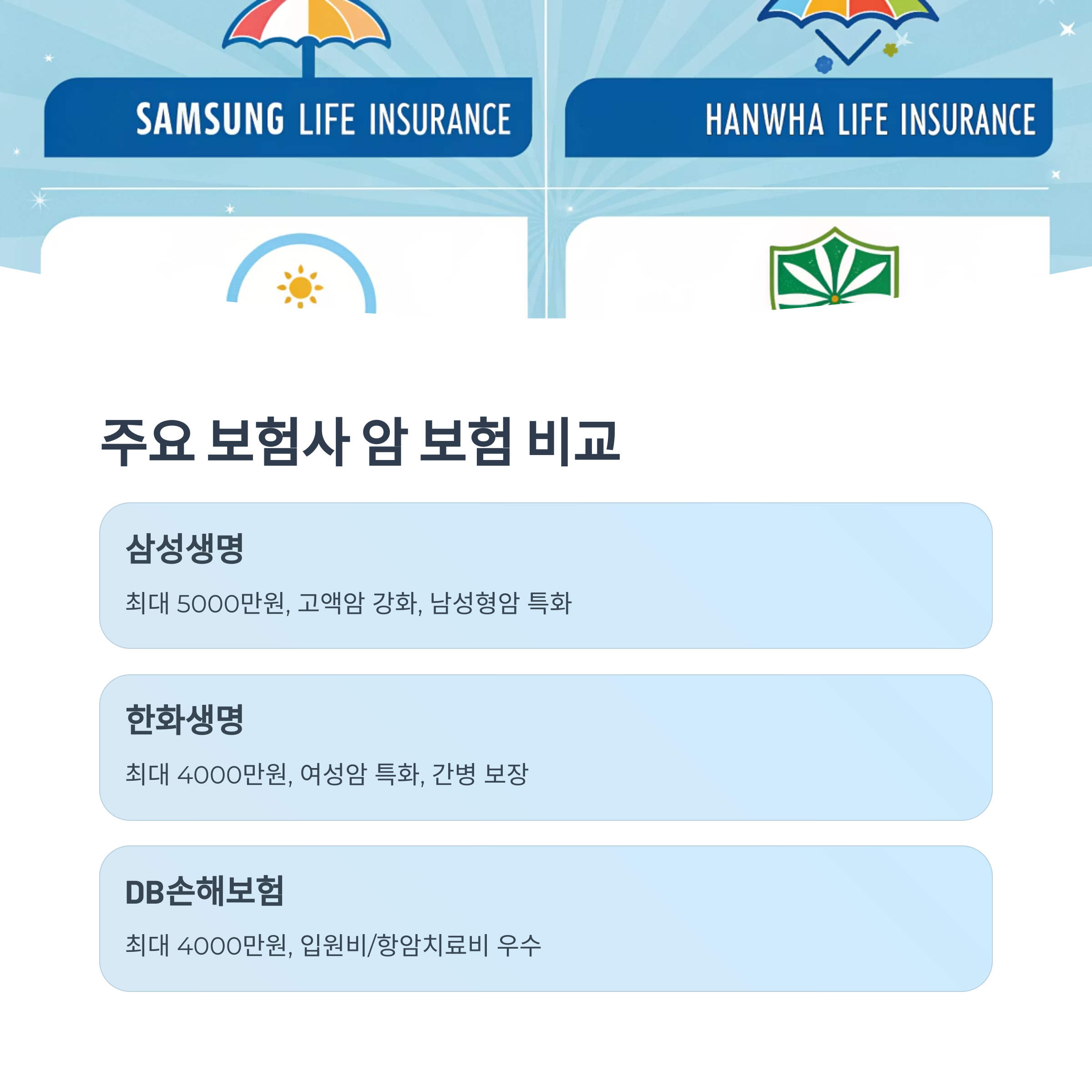 | 삼성생명 | 암플러스 | 최대 5000만원 | 고액암 강화, 남성형암 특화 | 비갱신형 |