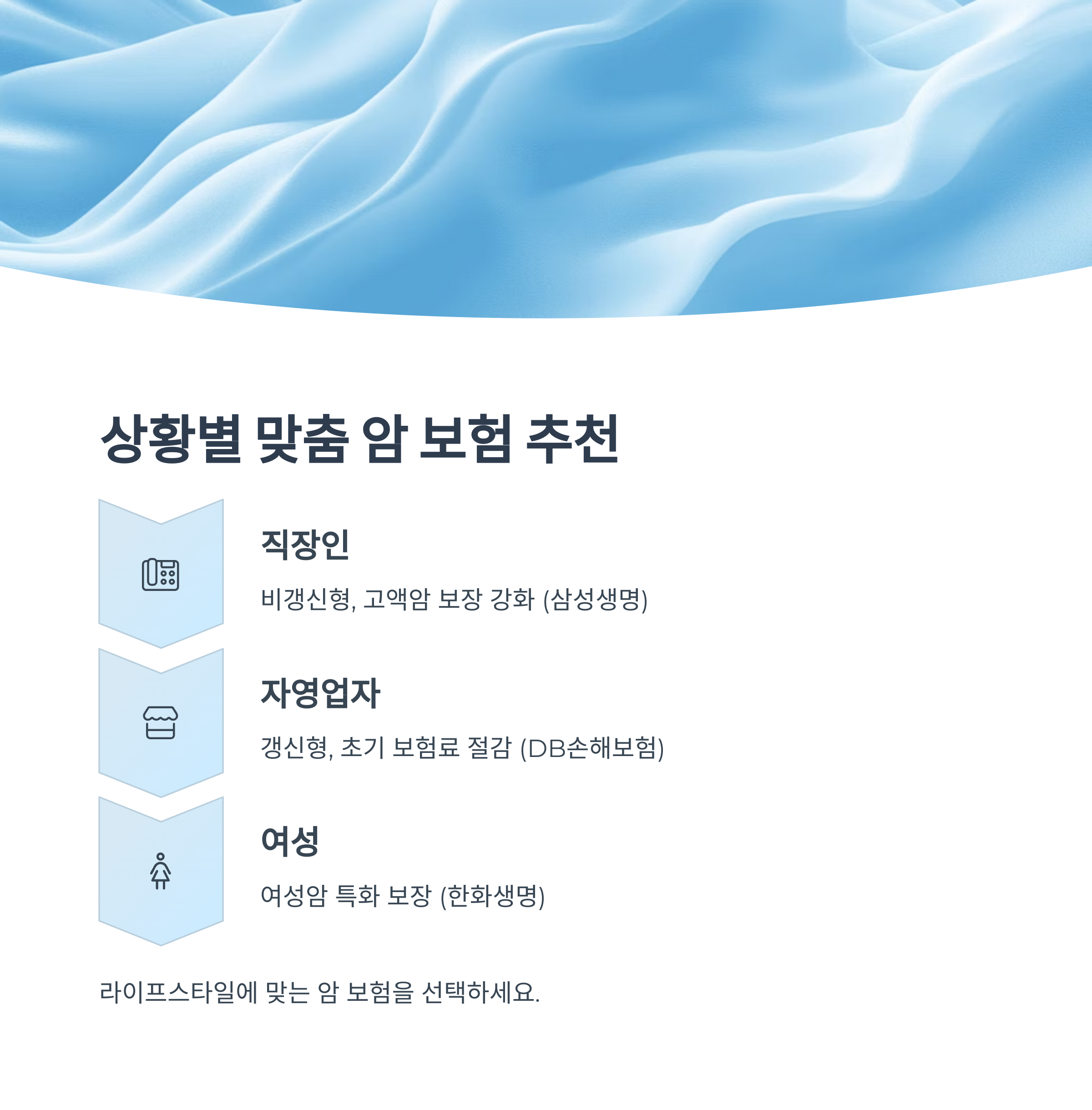 📌 직장인: 일정한 소득이 있는 직장인은 비갱신형 상품으로 장기 안정성을 확보하는 게 좋아요. 월 보험료가 부담되지 않는 선에서 고액암 보장을 강화하면 든든하죠. 삼성생명 또는 교보생명이 적합해요.
