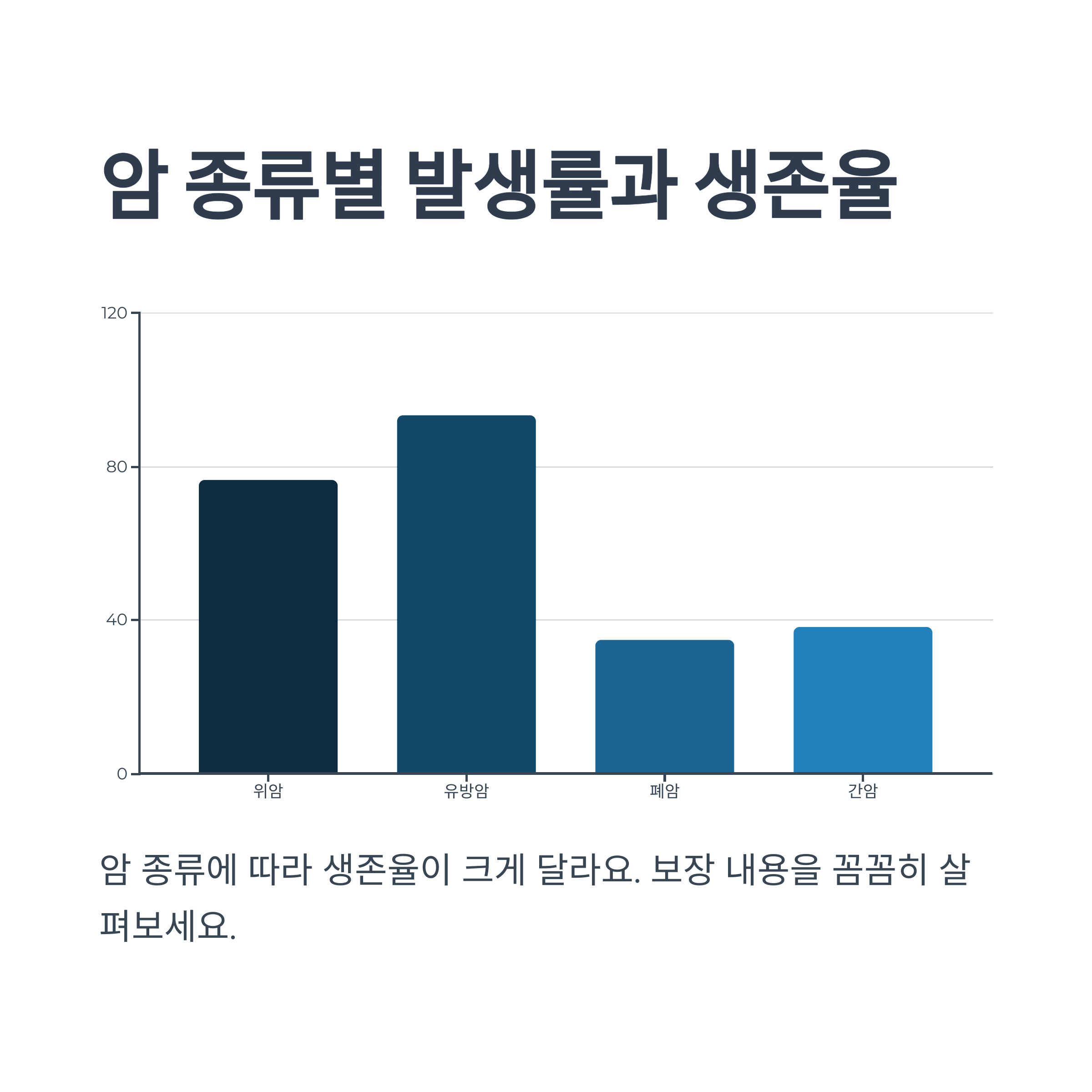 이처럼 암 종류에 따라 발생률과 생존율이 달라요. 따라서 보험을 가입할 때도 단순히 ‘암’이라는 하나의 기준보다는 구체적인 보장 항목을 살펴봐야 해요.