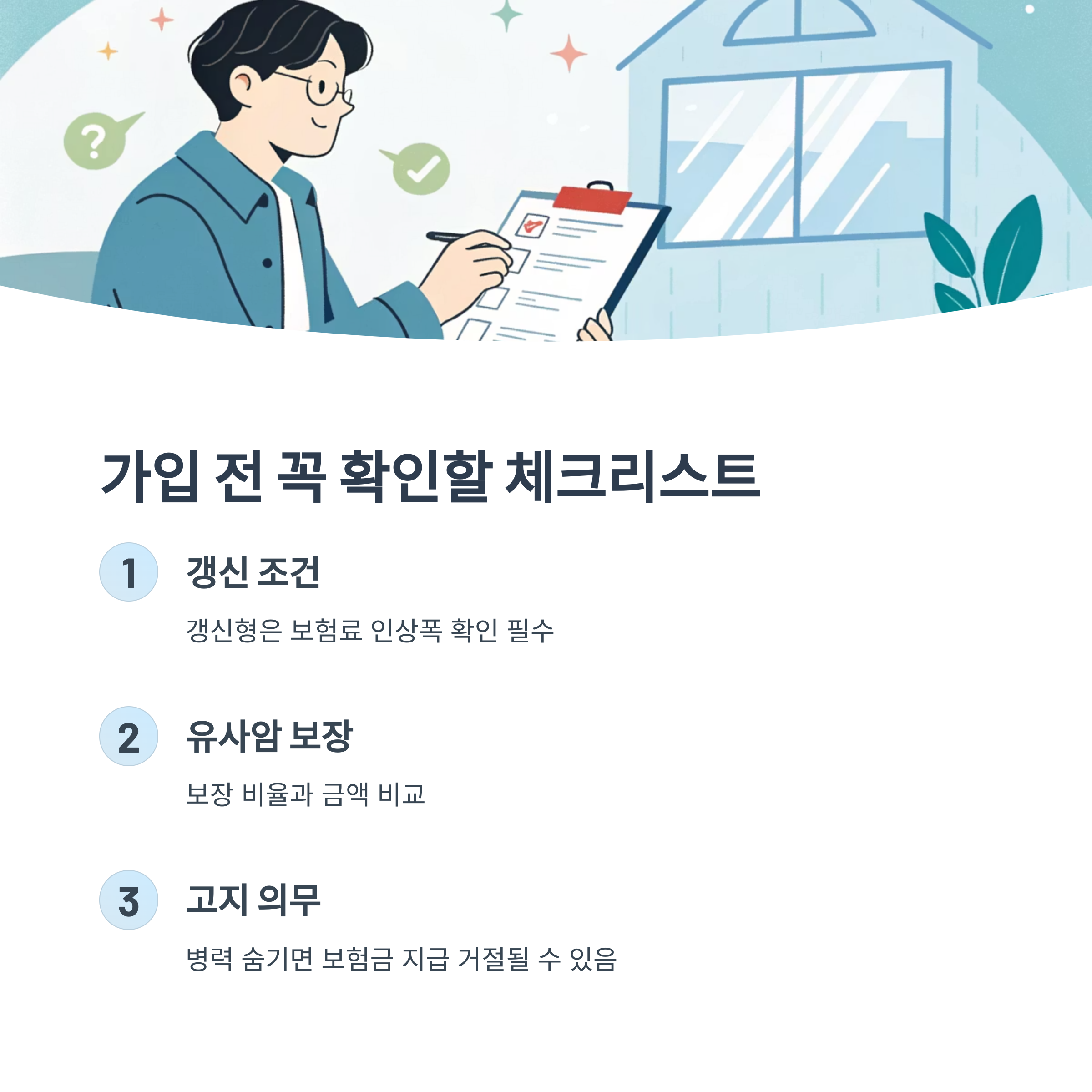 첫째, 갱신형인지 비갱신형인지 꼭 확인하세요. 갱신형은 나중에 보험료가 크게 오를 수 있으니, 장기적인 비용을 고려하면 비갱신형이 유리할 수 있어요.