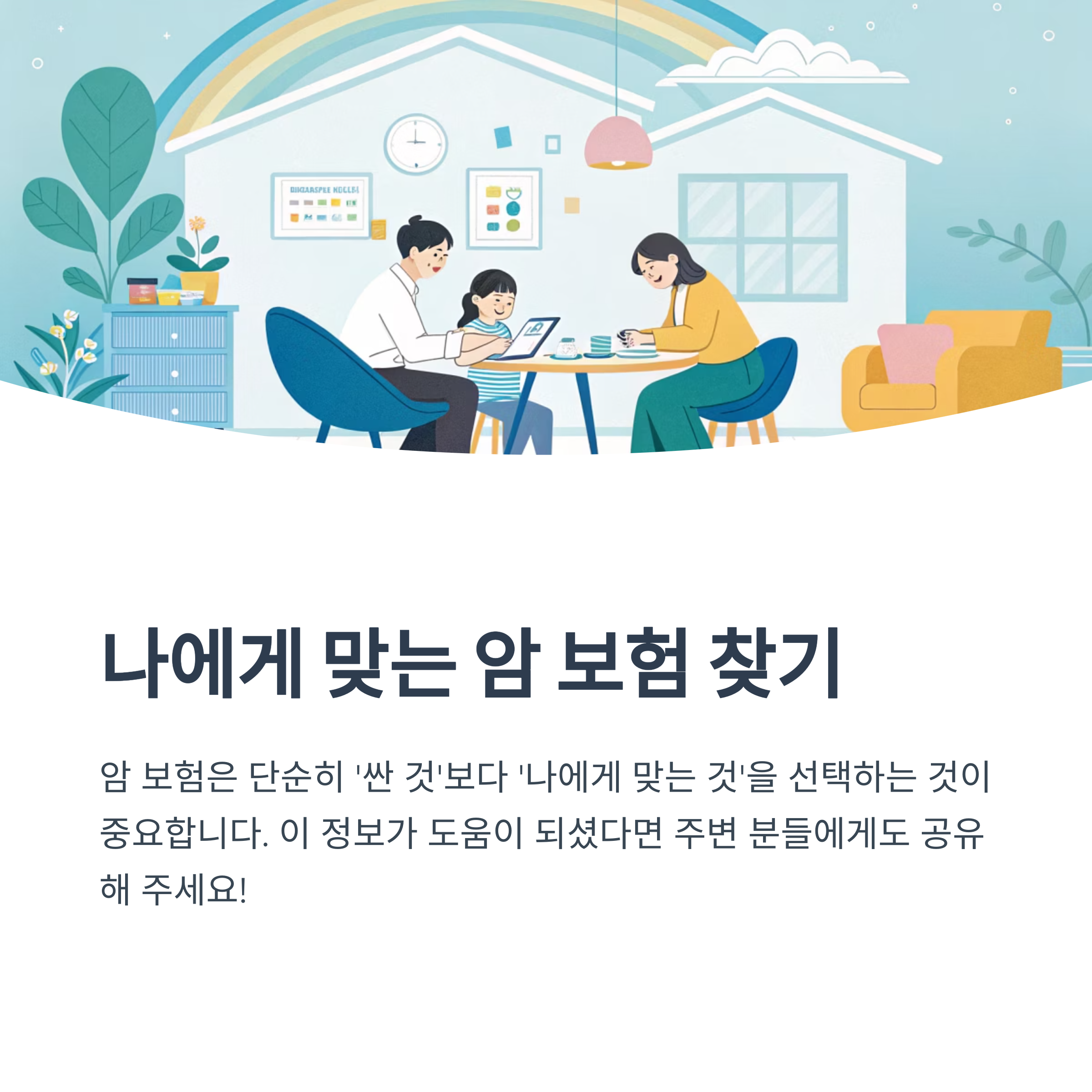 보험은 신중함이 답이에요. 지금 시간이 조금 더 걸리더라도, 비교 분석해서 나에게 가장 잘 맞는 암 보험을 선택해야 나중에 후회하지 않아요.