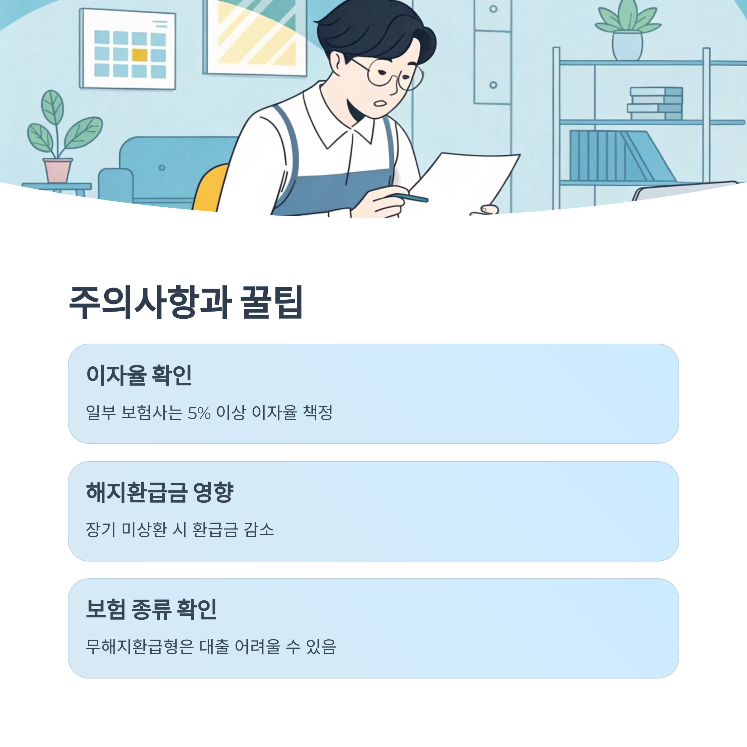 세 번째는 보험 종류에 따라 대출 가능 여부가 다를 수 있다는 점이에요. 일부 건강보험이나 단기 보험은 대출이 불가능할 수 있으니 사전에 보험사에 확인해두면 좋아요. 특히 무해지환급형 상품은 해지환급금이 적거나 없을 수 있으니 주의하세요.