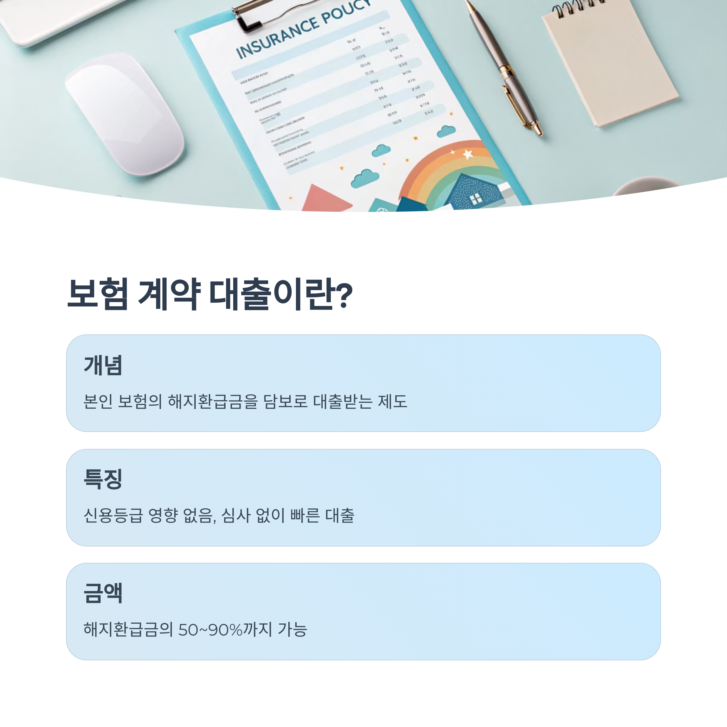 보험 계약 대출은 본인이 가입한 보험의 해지환급금을 담보로 자금을 빌릴 수 있는 제도예요. 대출을 받을 때 신용등급 하락이나 보증인이 필요 없다는 점에서 많은 사람들이 선택하고 있는 금융 수단이에요. 특히 갑작스러운 자금이 필요한 상황에서 빠르게 활용할 수 있는 점이 큰 장점이랍니다.