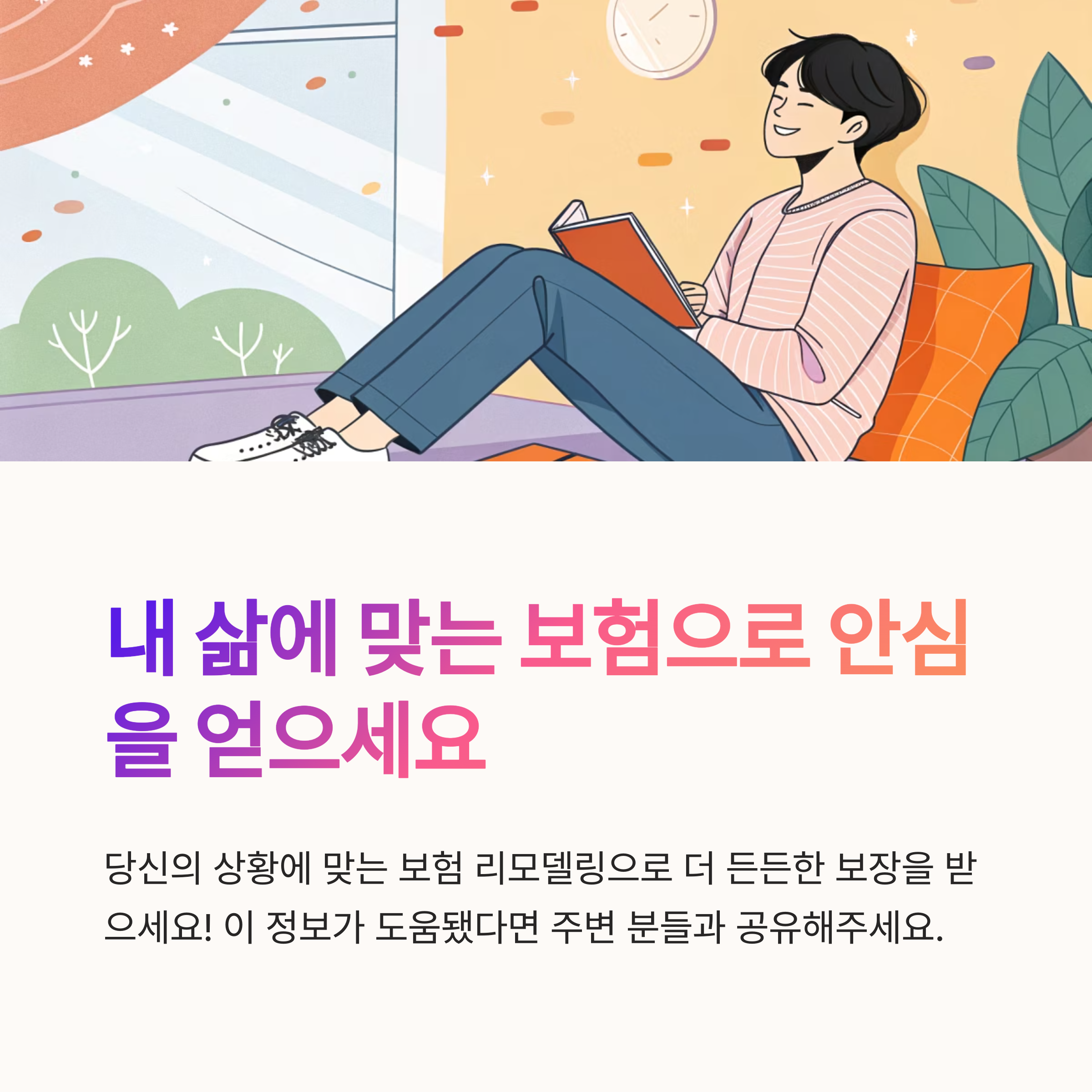 보험 리모델링은 단기적 절약보다 ‘지속 가능성’을 우선해야 해요. 무리 없는 범위에서 최대의 보장을 받는 구조로 짜야 실질적인 도움이 되죠. 💰