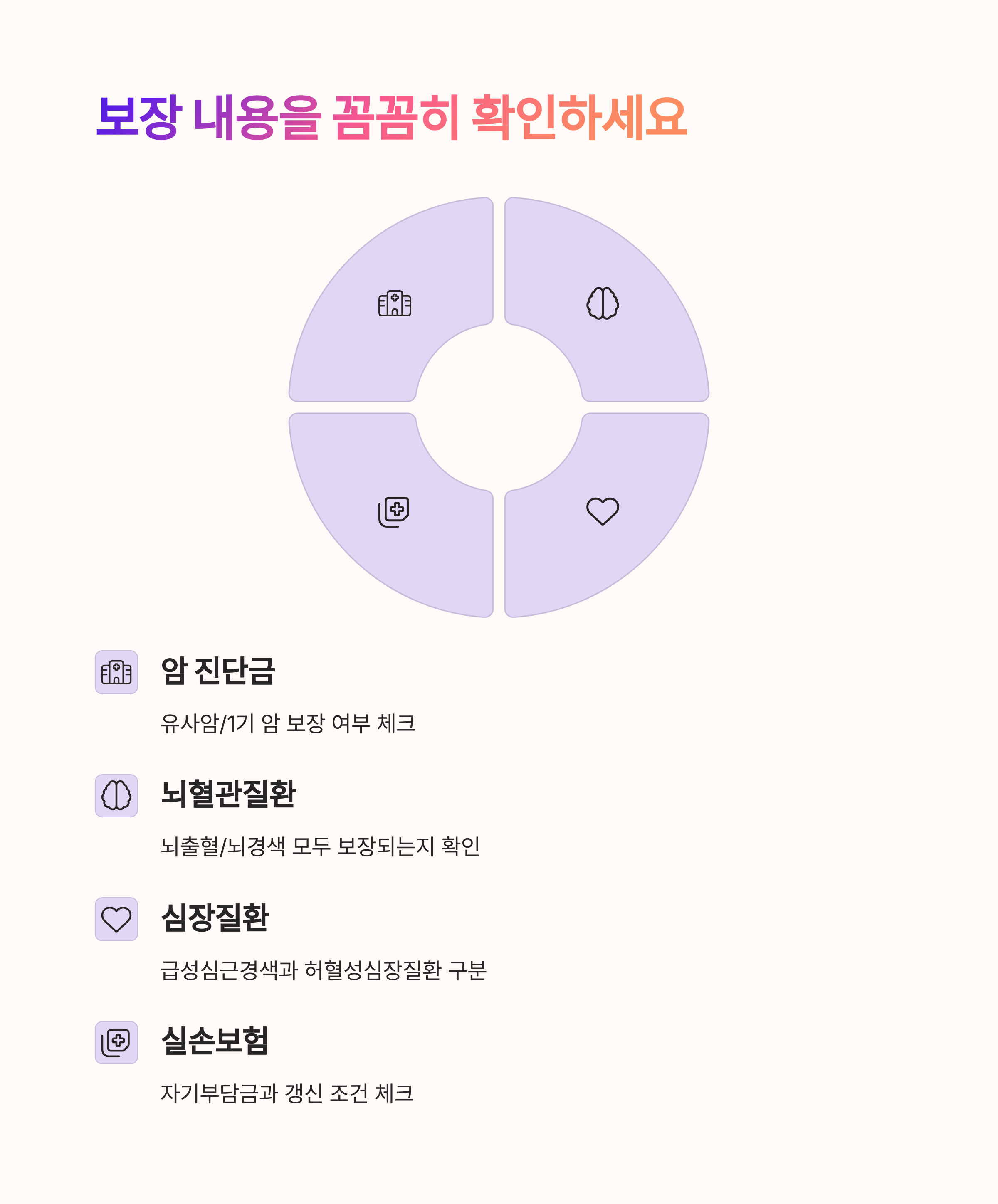보험 리모델링에서는 어떤 보장을 얼마나 받는지 구체적으로 확인하는 게 핵심이에요. 보장 범위가 너무 넓으면 보험료가 과도할 수 있고, 너무 좁으면 정작 필요할 때 혜택을 못 받는 상황이 생기니까요.