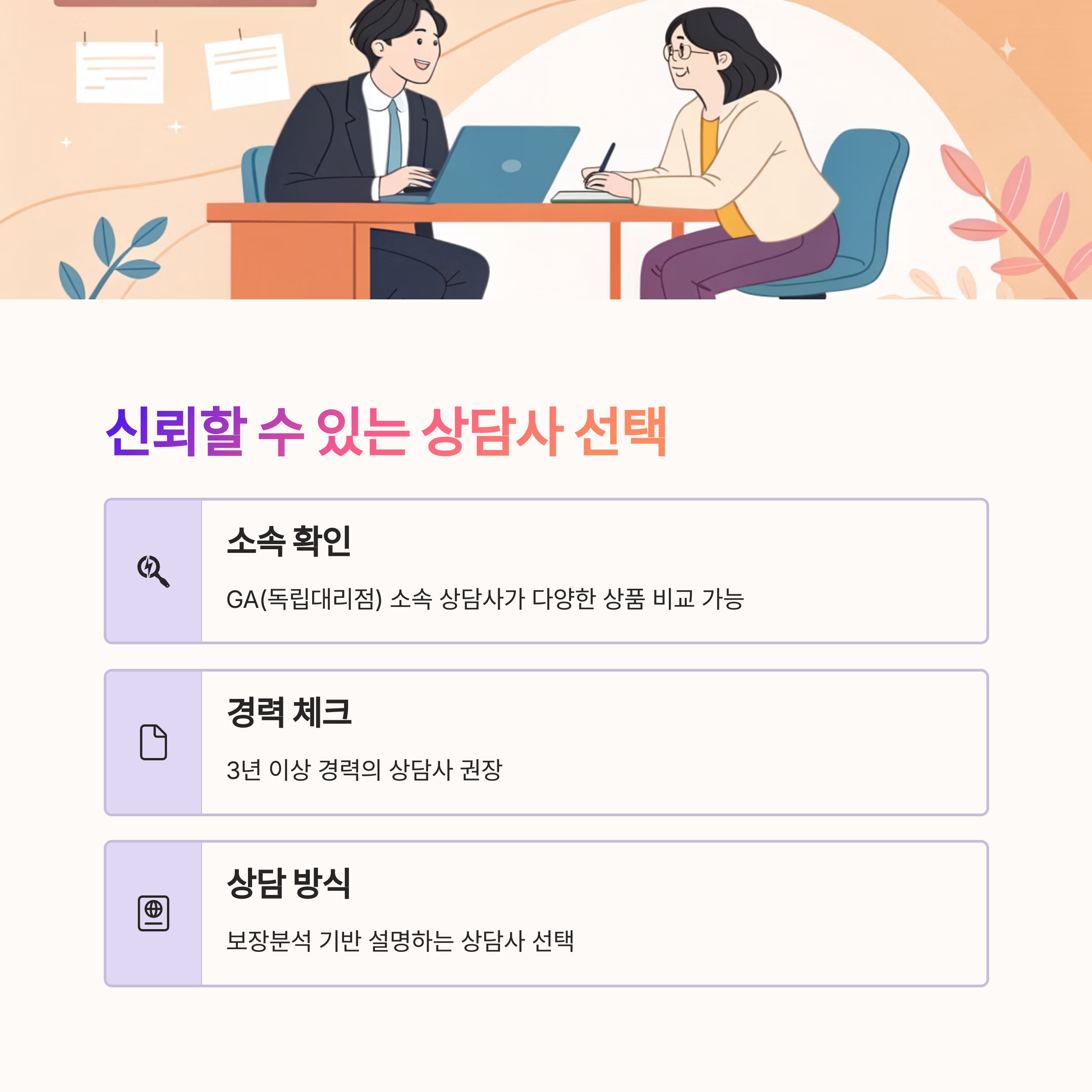 상담사를 선택할 때는 보험 대리점 소속인지, 한 보험사 전속인지도 체크해보는 게 좋아요. 전속 설계사는 특정 보험사 상품에 집중되기 때문에 다양한 상품을 비교하기 어려울 수 있어요. 반면 GA(독립 보험대리점) 소속 설계사는 여러 보험사의 상품을 비교해 줄 수 있죠.