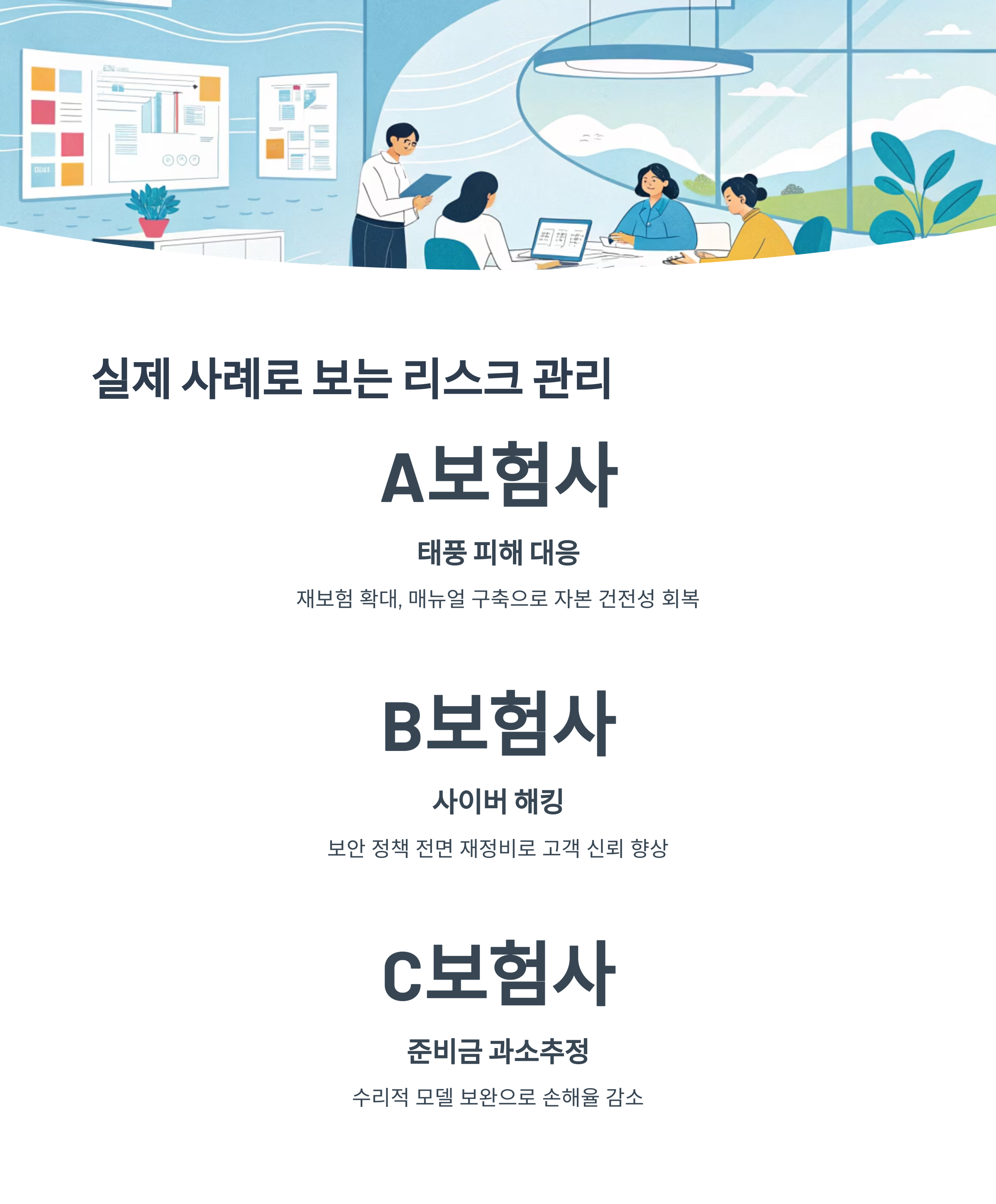 | A보험사 | 태풍 피해 대응 실패 | 재보험 확대, 매뉴얼 구축 | 자본 건전성 회복 |