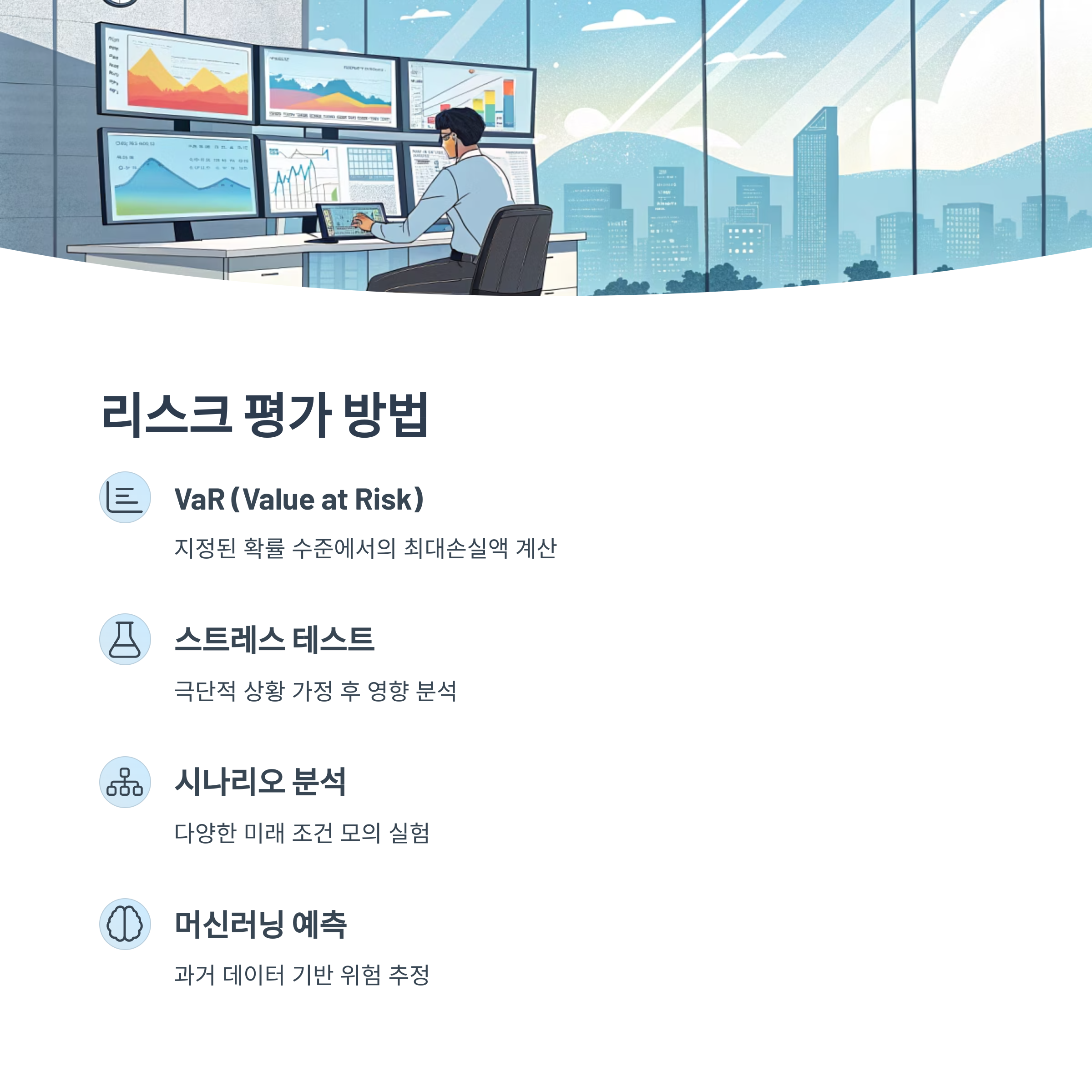 대표적인 평가 도구로는 ‘확률론적 모델링’, ‘시나리오 분석’, ‘스트레스 테스트’, 그리고 ‘Value at Risk (VaR)’ 등이 있어요. 특히 VaR는 보험사가 일정 수준의 손실을 입을 확률을 수치로 보여주기 때문에 자산운용과 자본적정성 판단에 자주 활용돼요.