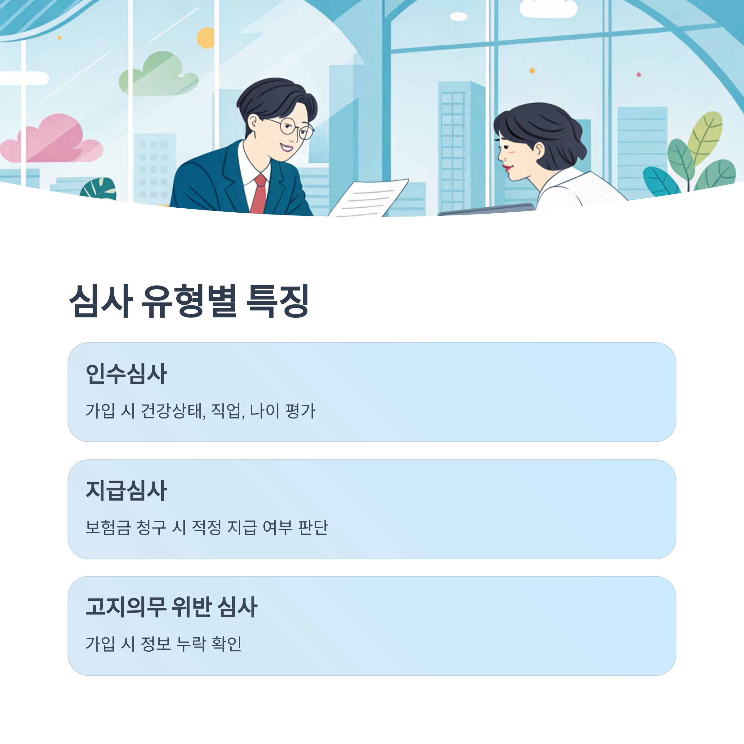 보험 심사는 크게 세 가지로 나뉘어요. 첫째는 ‘인수심사’로, 고객이 보험에 가입할 때 건강 상태, 직업, 나이 등을 평가해서 가입 여부를 결정하는 과정이에요. 둘째는 ‘지급심사’로, 보험금 청구 시 적정한 지급 여부를 판단하는 절차고요.