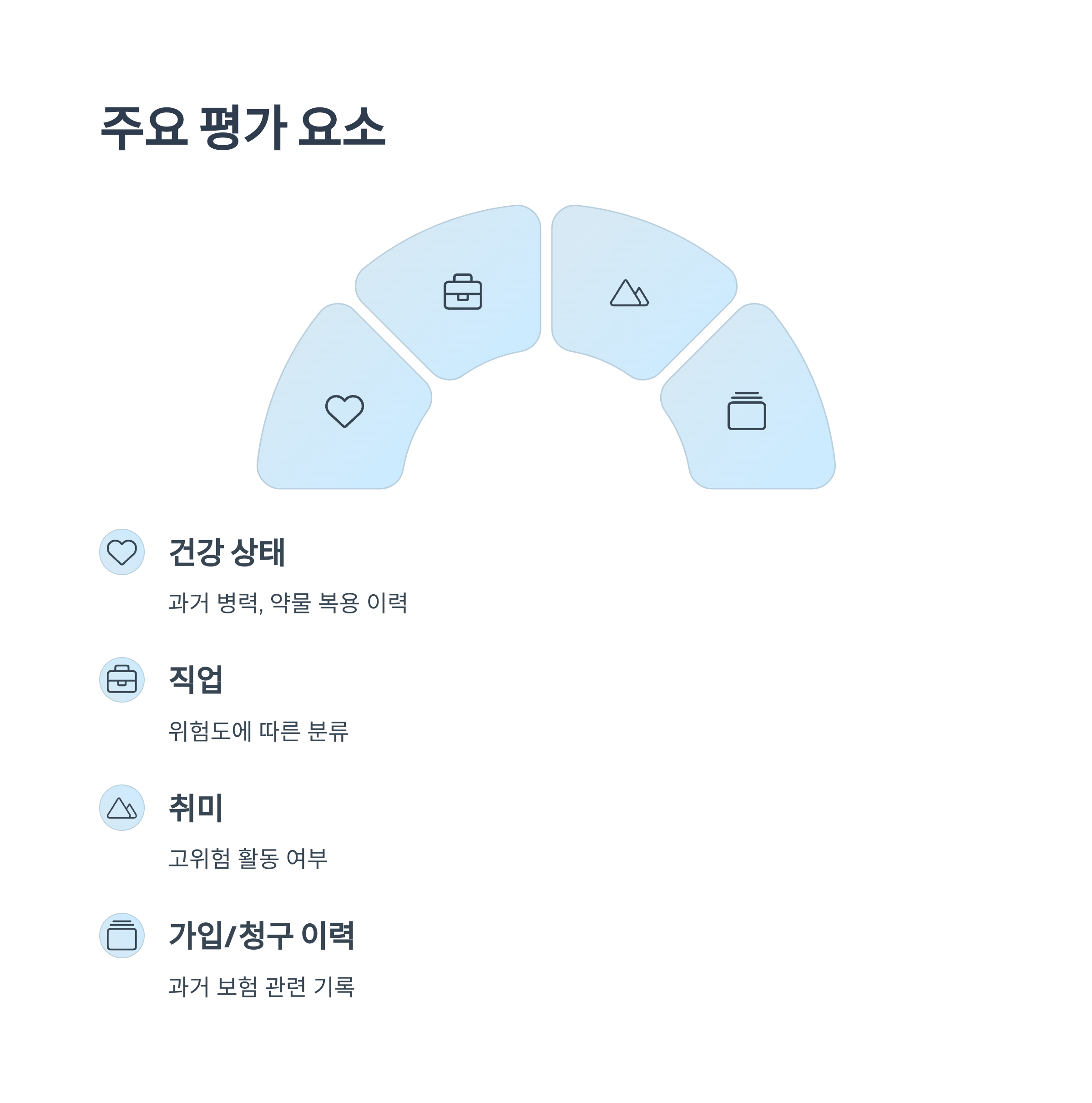 보험 심사에서 중요한 평가 요소는 다양해요. 대표적으로 고객의 건강 상태, 과거 병력, 직업, 생활 습관, 보험 가입 이력, 청구 내역 등이 포함돼요. 특히 건강 상태는 대부분의 보험 심사에서 핵심적인 역할을 하죠.