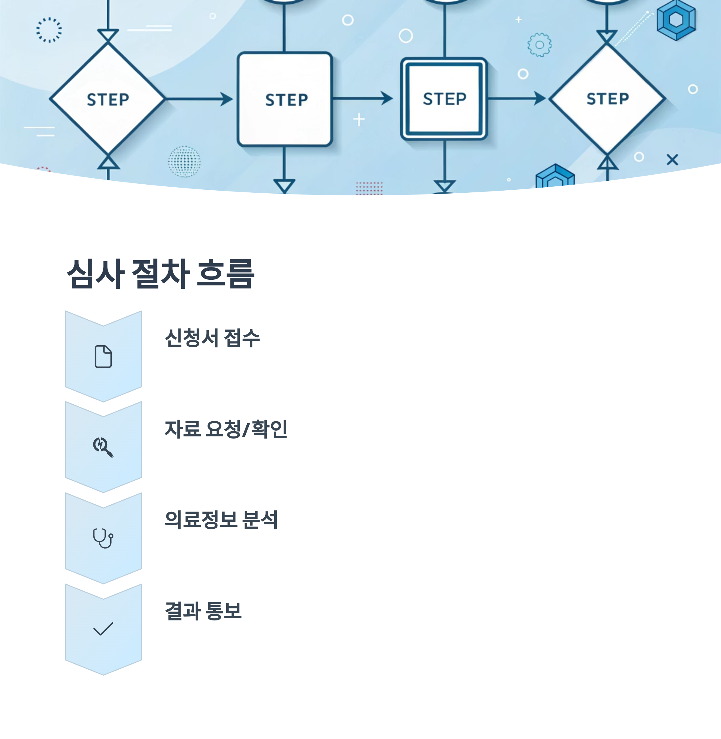 보험 심사의 전형적인 흐름은 다음과 같아요. 1) 신청서 접수 → 2) 자료 요청 → 3) 의료정보 확인 → 4) 심사 결과 통보 → 5) 계약 체결 또는 거절이에요.