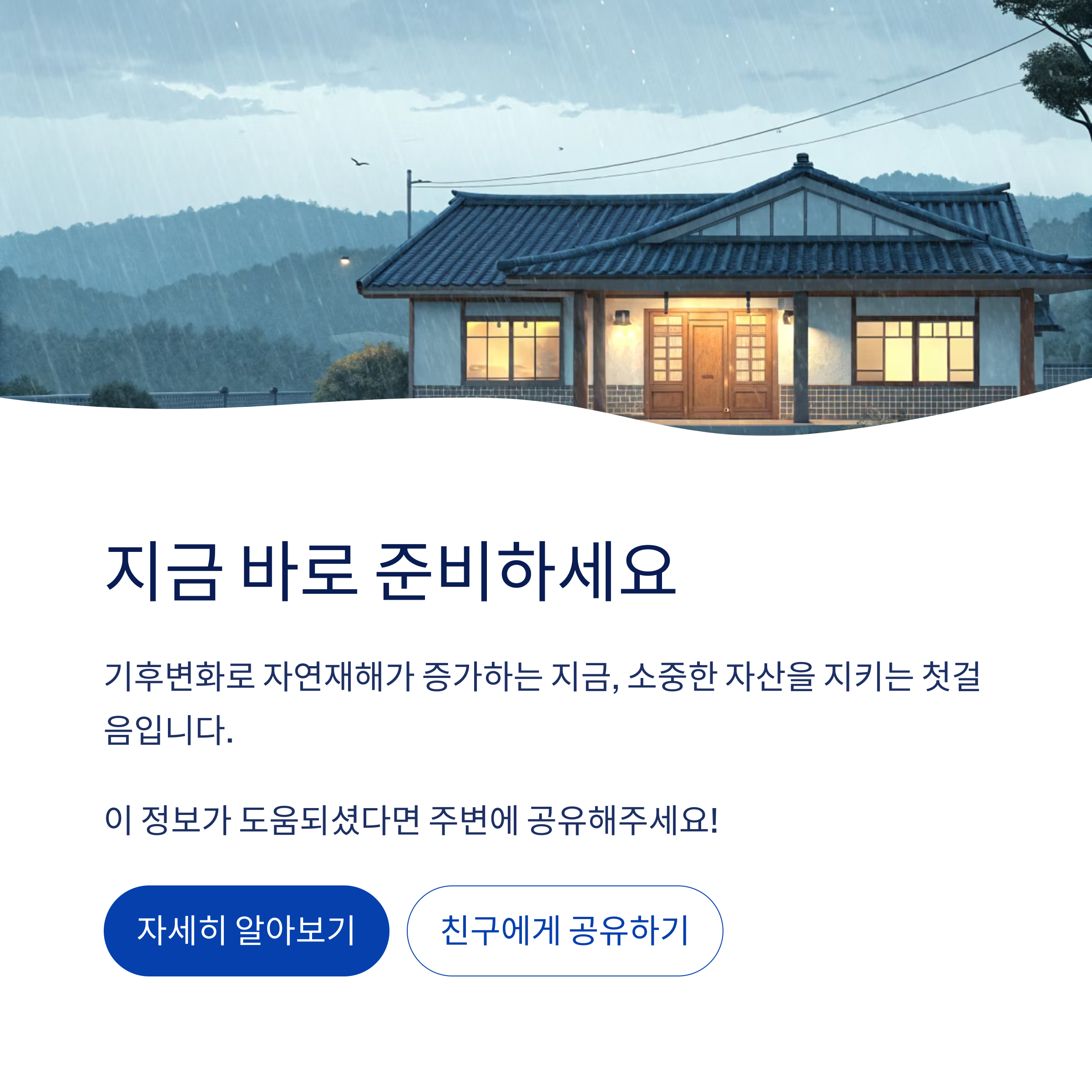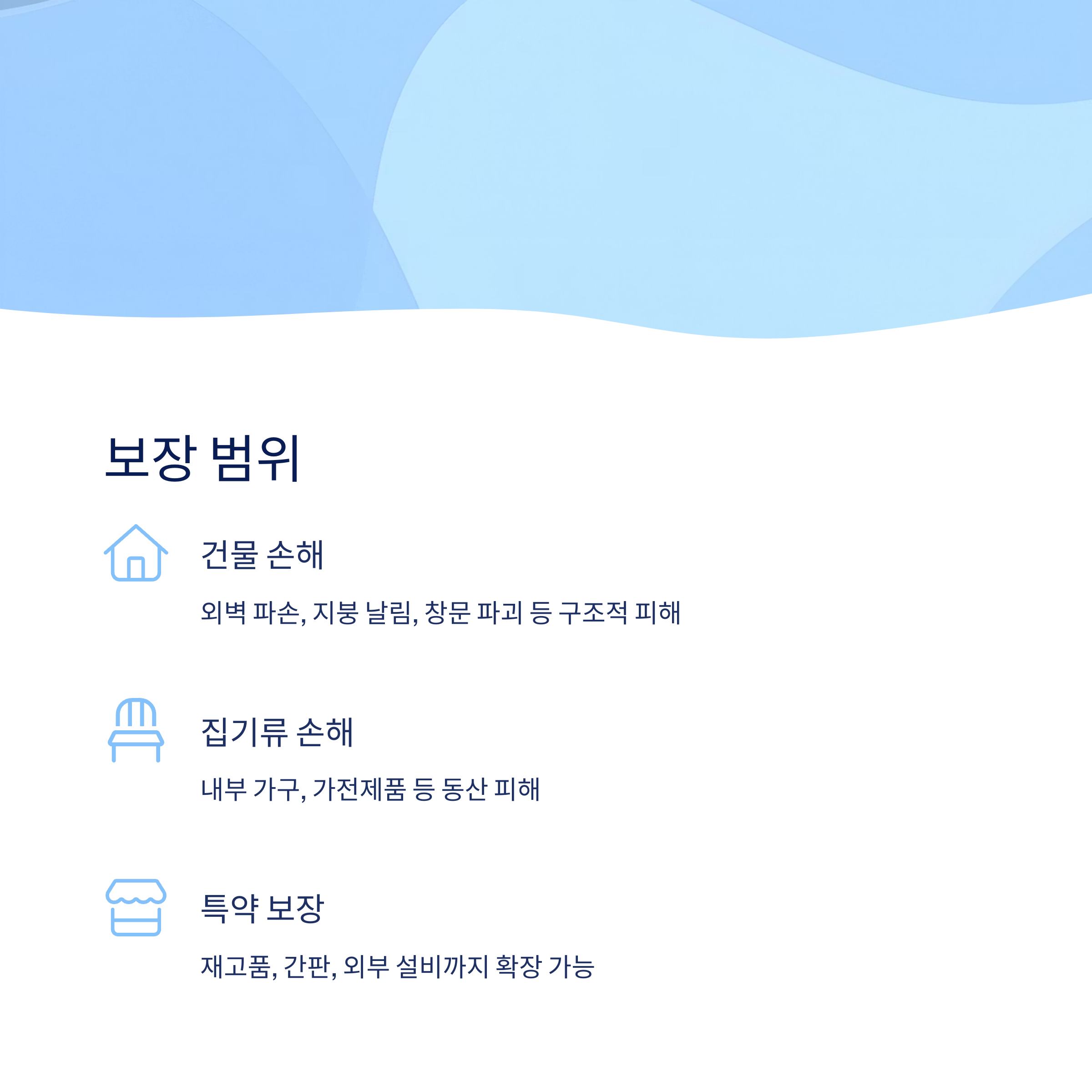 | 건물 피해 | 태풍/폭우로 인한 외벽, 지붕, 창문 손상 | 기본 포함 |