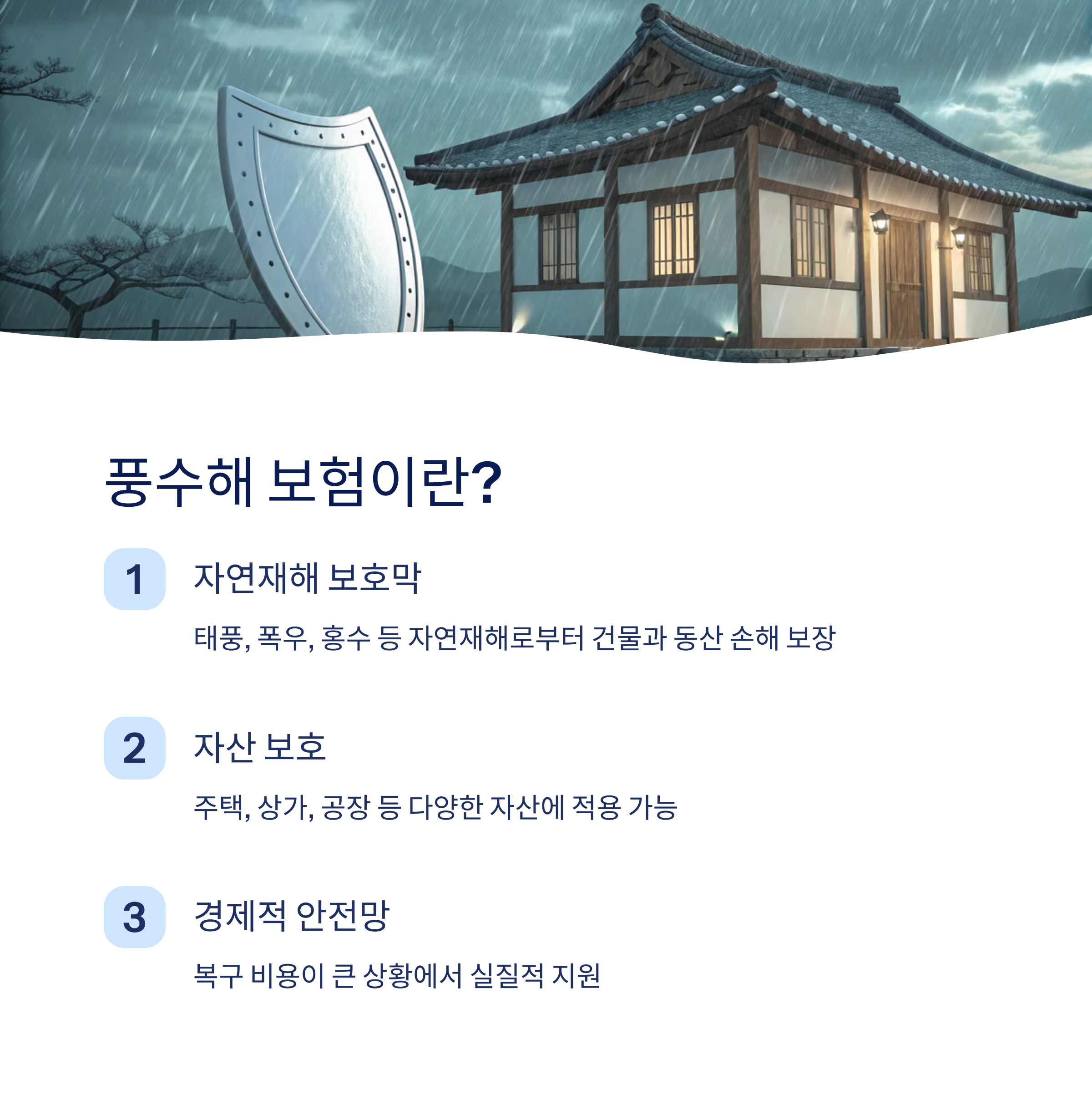 풍수해 보험은 자연재해로부터 건물이나 동산의 손해를 보장받을 수 있는 보험이에요. 특히 폭우, 태풍, 해일, 강풍, 홍수 등 기상 현상에 의해 발생한 피해가 주요 보장 항목에 해당되죠.