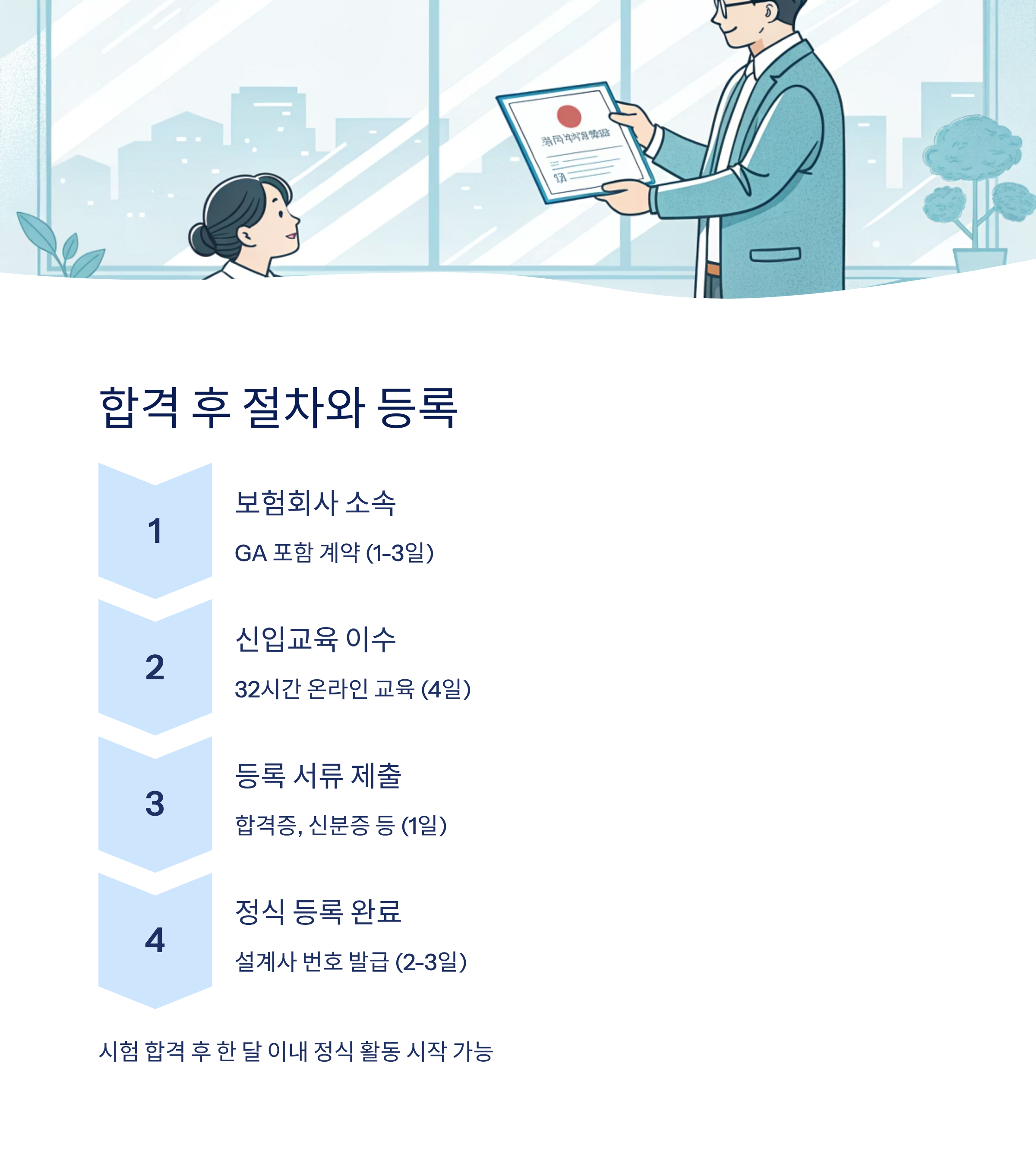 이 모든 절차는 보통 1~2주 안에 마무리돼요. 빠르게 움직이면 시험 합격 후 한 달 이내에 정식 설계사로 활동을 시작할 수 있어요. 등록 후에도 꾸준한 보수 교육과 윤리 이수가 필요하다는 것도 꼭 기억해두세요! 👍
