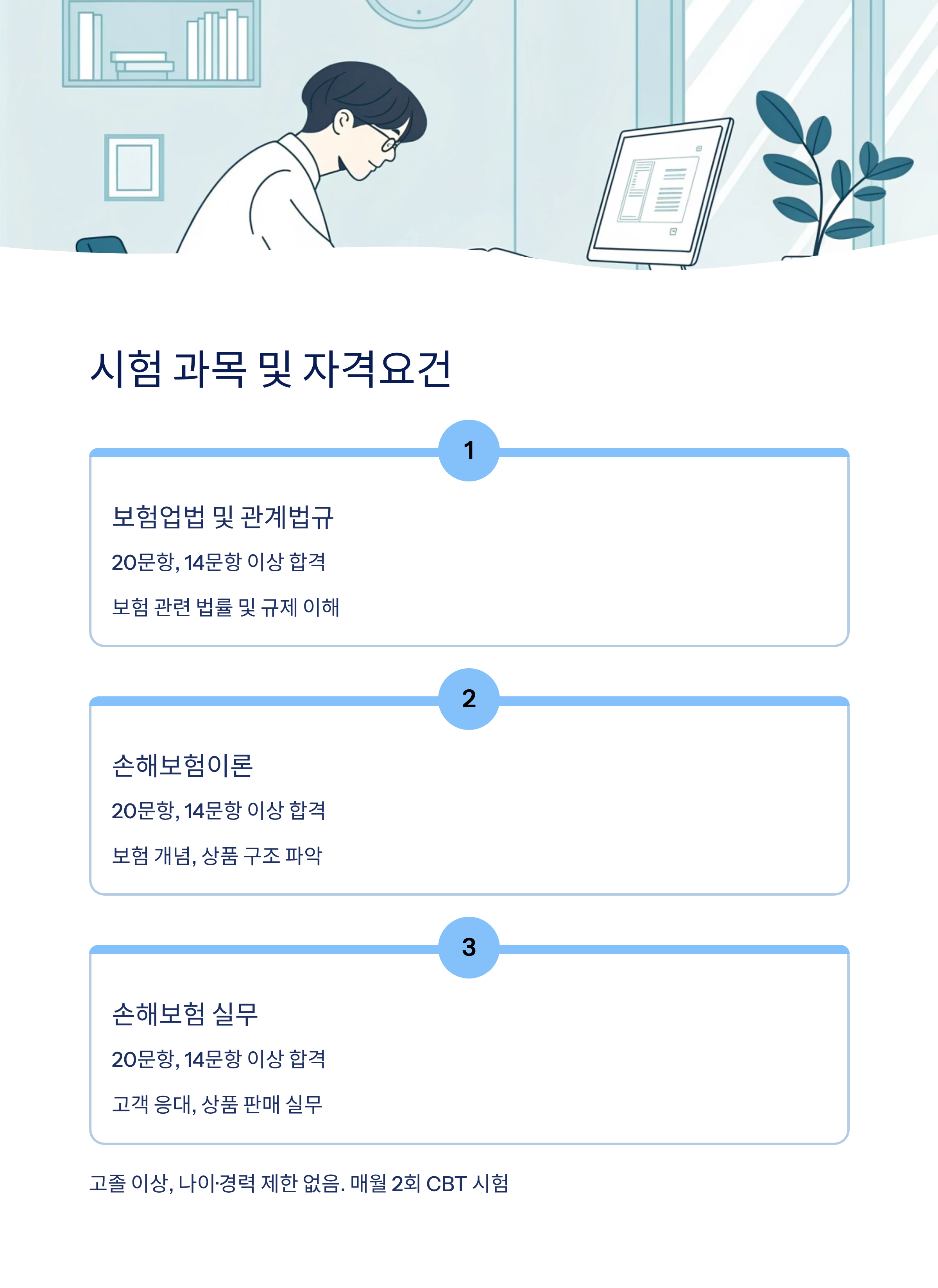시험 과목은 총 3가지로 구성돼요. 각각은 보험업법 및 관계법규, 손해보험이론, 실무이론이에요. 문제는 객관식 4지선다형으로 출제되며, 과목당 20문항씩 총 60문항이에요. 각 과목 14문제 이상, 전체 평균 60점 이상을 맞아야 합격이 가능해요. 무작정 암기보다는 개념을 이해하고 적용하는 방식으로 공부하는 게 좋아요.