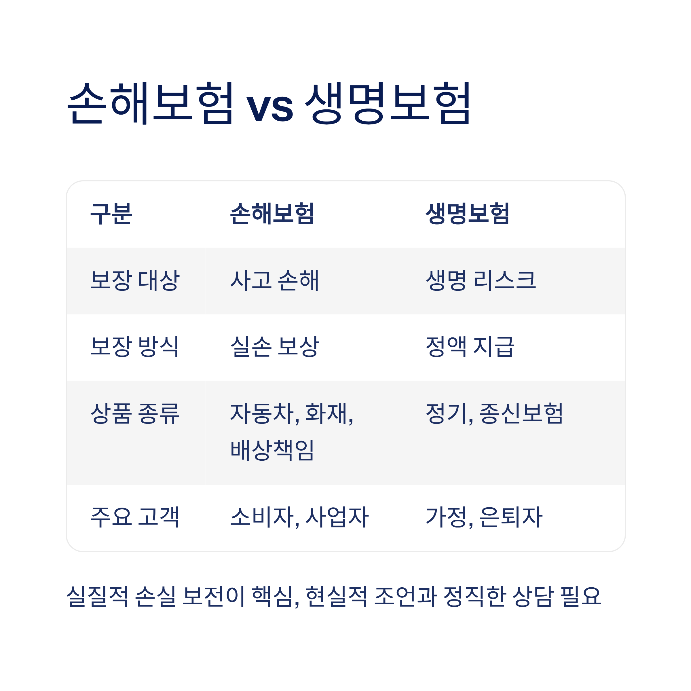 | 상품 종류 | 자동차, 화재, 배상책임 등 | 정기보험, 종신보험 등 |
