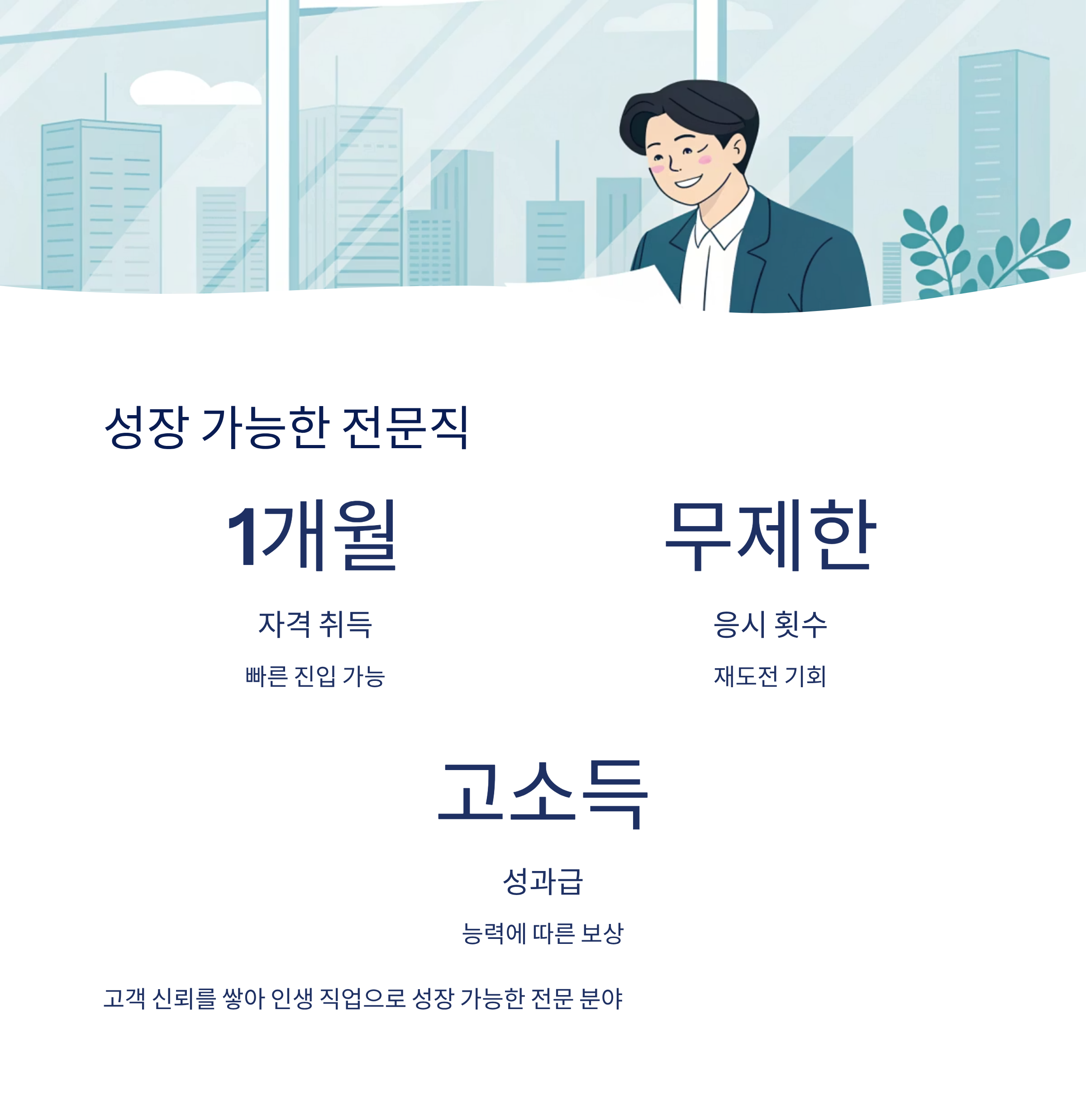 자격증 하나만으로도 충분히 진입 가능한 직업이지만, 이후 CFP, AFPK 같은 고급 자격증이나 손해사정사, 보험계리사 등으로 확장해나가면 전문성과 소득 수준을 한층 높일 수 있어요. 직업 안정성도 높은 편이고, 자유로운 근무 환경과 높은 성과급이 장점이에요.