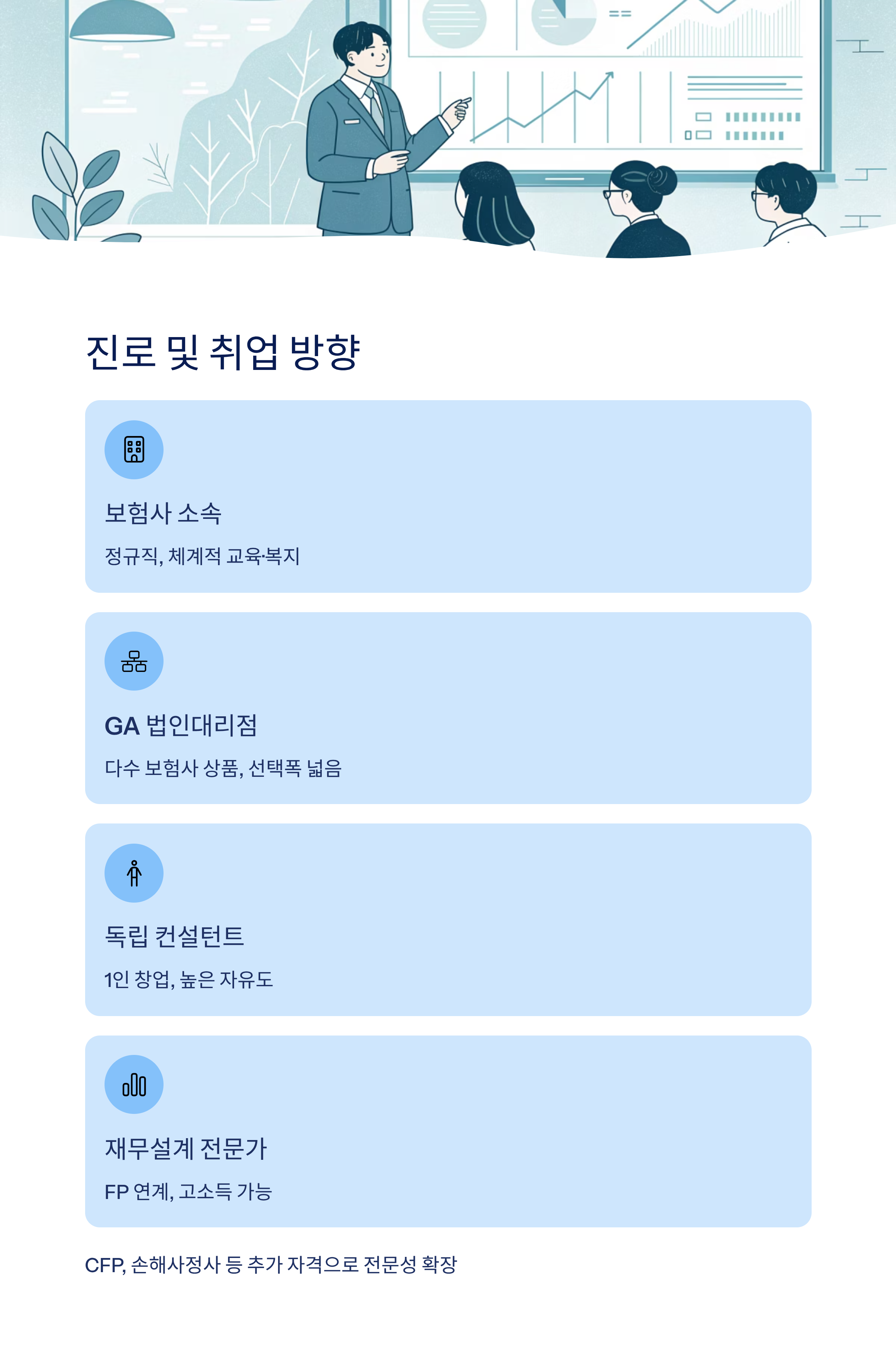 손해보험설계사 자격증을 취득한 후에는 다양한 경로로 커리어를 확장할 수 있어요. 가장 일반적인 진로는 보험회사에 소속되어 개인 또는 법인 고객을 대상으로 보험 컨설팅을 제공하는 일이에요. 하지만 그 외에도 금융사 콜센터, 고객지원, GA(법인대리점), 독립 보험설계사로의 활동도 가능하답니다. 🧑💼