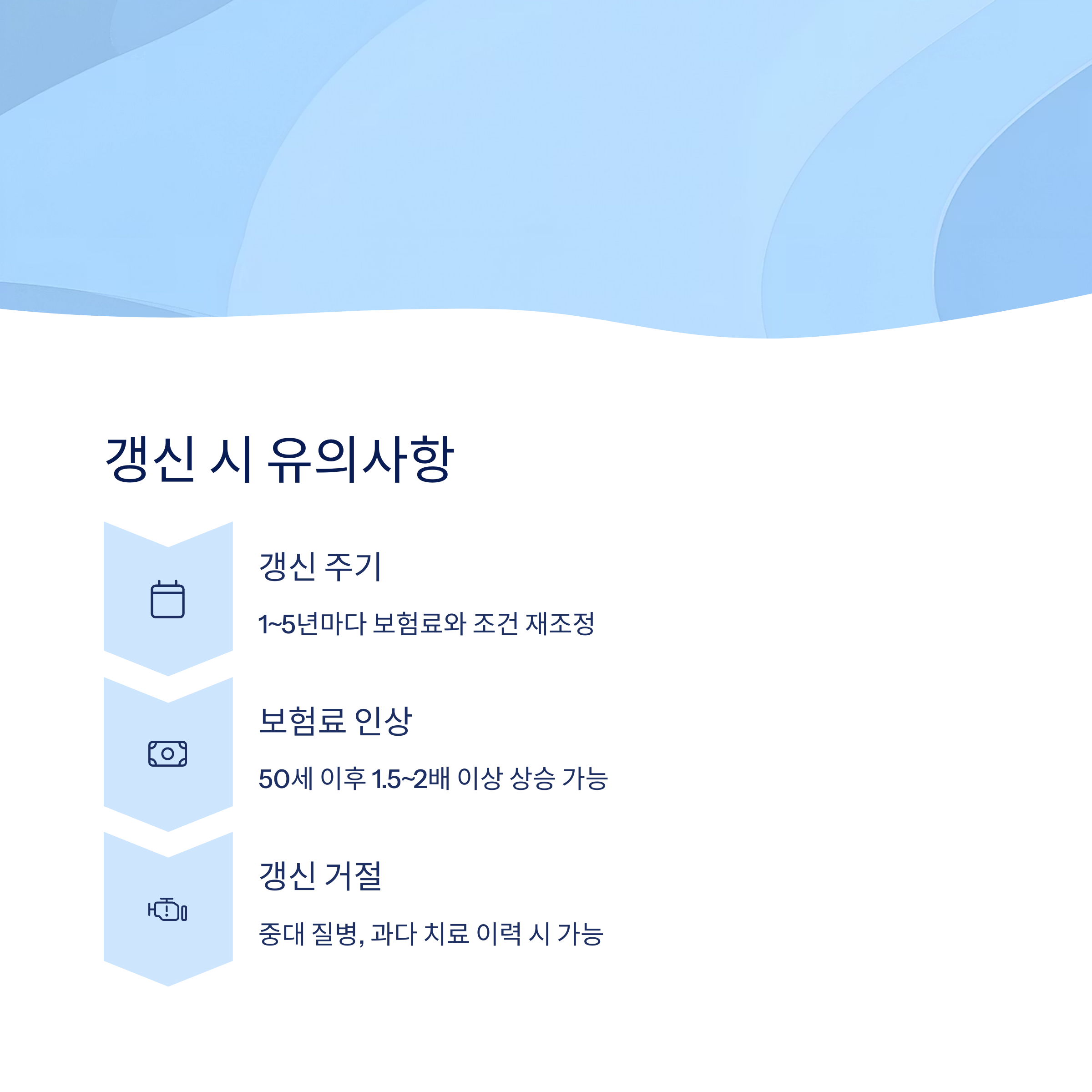 또 하나 주의할 점은 갱신 시 보험료가 거의 매번 인상된다는 거예요. 나이가 들수록 병원 방문이 잦아지기 때문에, 보험료도 그에 맞춰 올라가요. 50세 이후부터는 보험료가 1.5배에서 2배 이상 상승하기도 해요. 갱신이 되더라도 경제적 부담이 커질 수 있어요.
