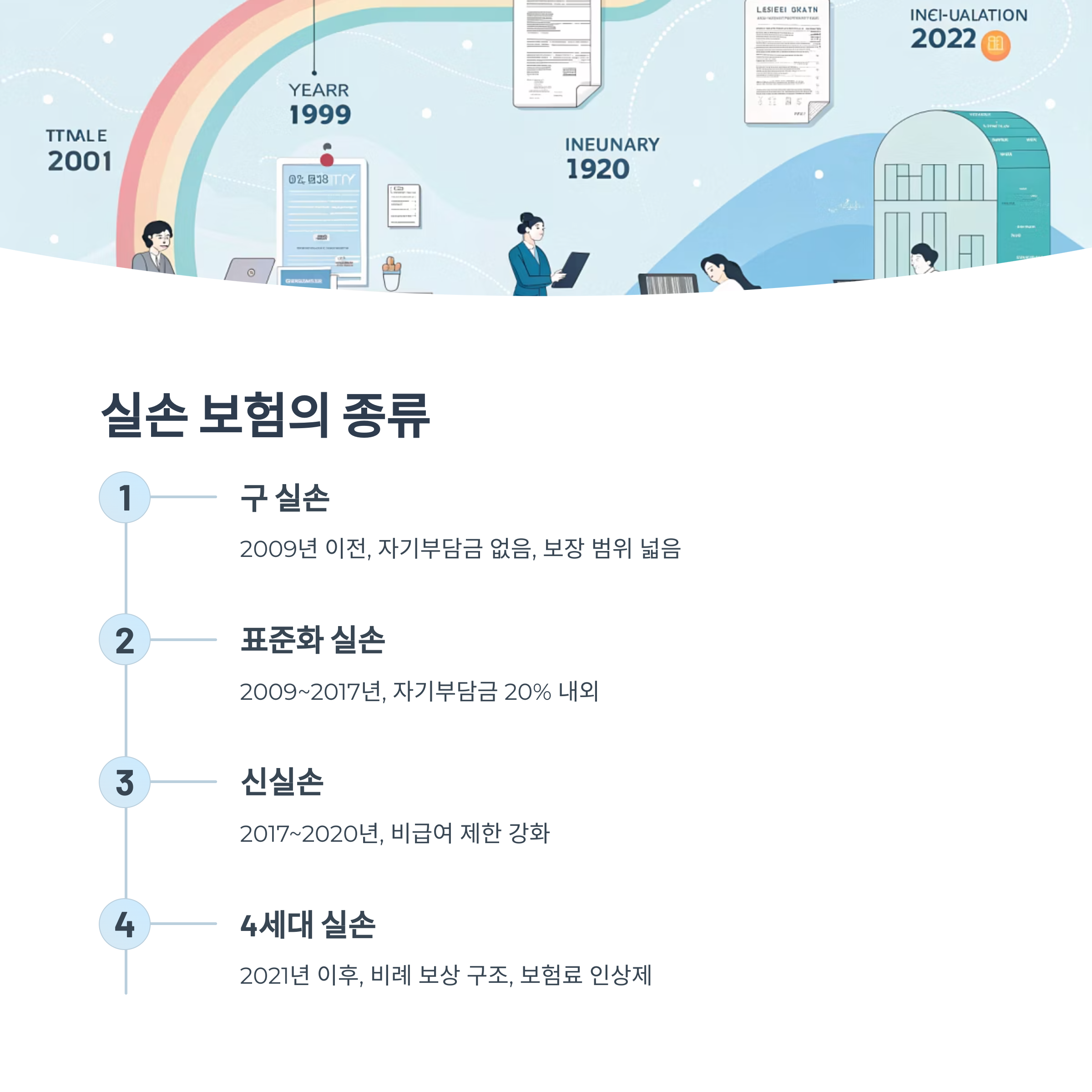 실손 보험은 크게 네 가지 시기로 나뉘어요. 2009년 이전은 ‘구 실손’, 2009~2017년은 ‘표준화 실손’, 2017~2020년은 ‘신실손’, 2021년 이후는 ‘4세대 실손’이에요. 각각 보장 방식과 자기부담금 구조가 달라요.