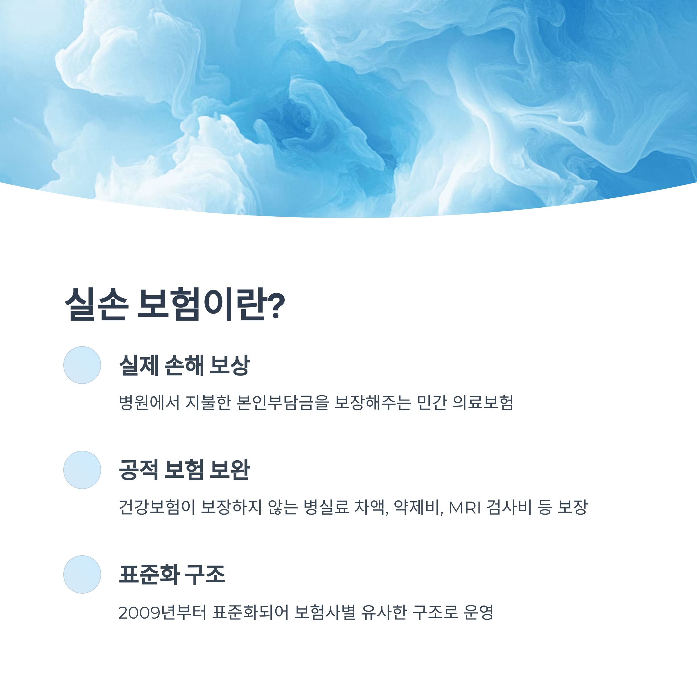공단에서 보장하는 건강보험은 입원비와 수술비 등의 일부만 부담해줘요. 그 외에 병실료 차액, 약제비, MRI 같은 고가 검사비는 개인이 부담하죠. 실손 보험은 이런 비용 부담을 줄여주는 든든한 파트너예요.