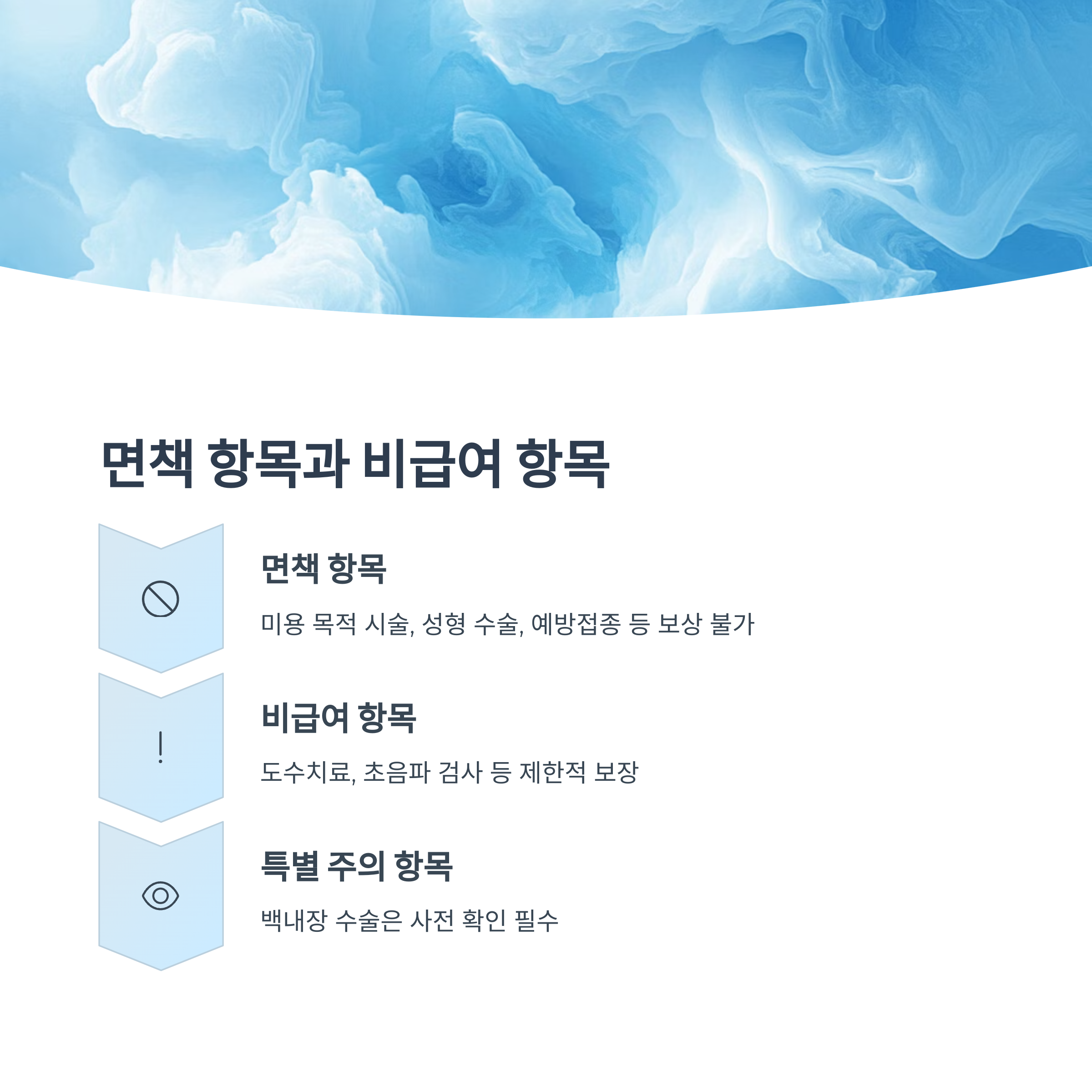 면책 항목이란 아예 보험금 청구가 불가능한 항목이에요. 대표적인 예로는 미용 목적의 시술, 성형 수술, 예방접종 등이 있어요. 아무리 진료비가 많이 나왔다고 해도, 보험사 입장에서 "이건 병 치료가 아니잖아요?"라고 판단되면 보상을 안 해줘요.