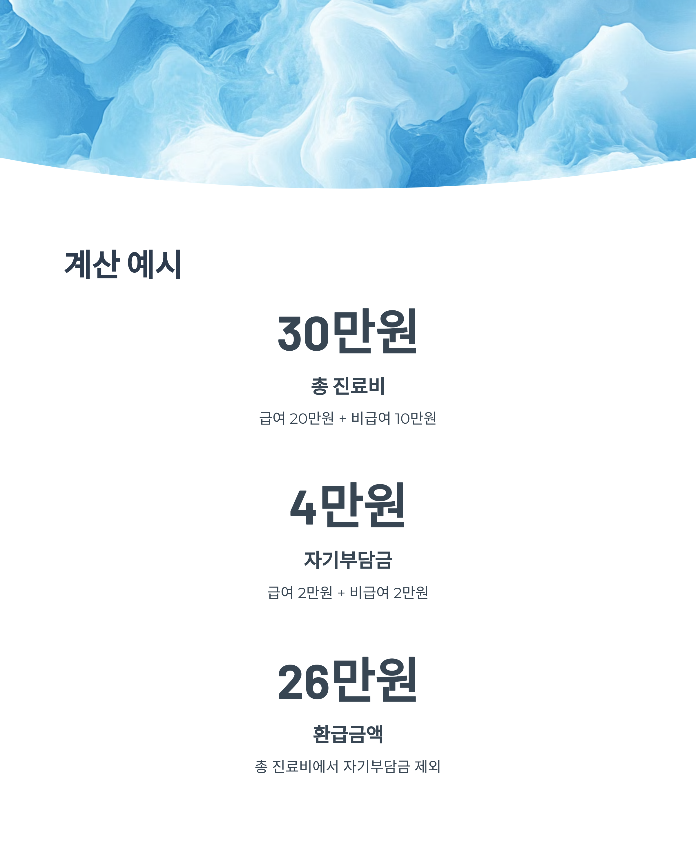 | 비급여 | 20~30% | 건강보험이 적용되지 않는 항목 |