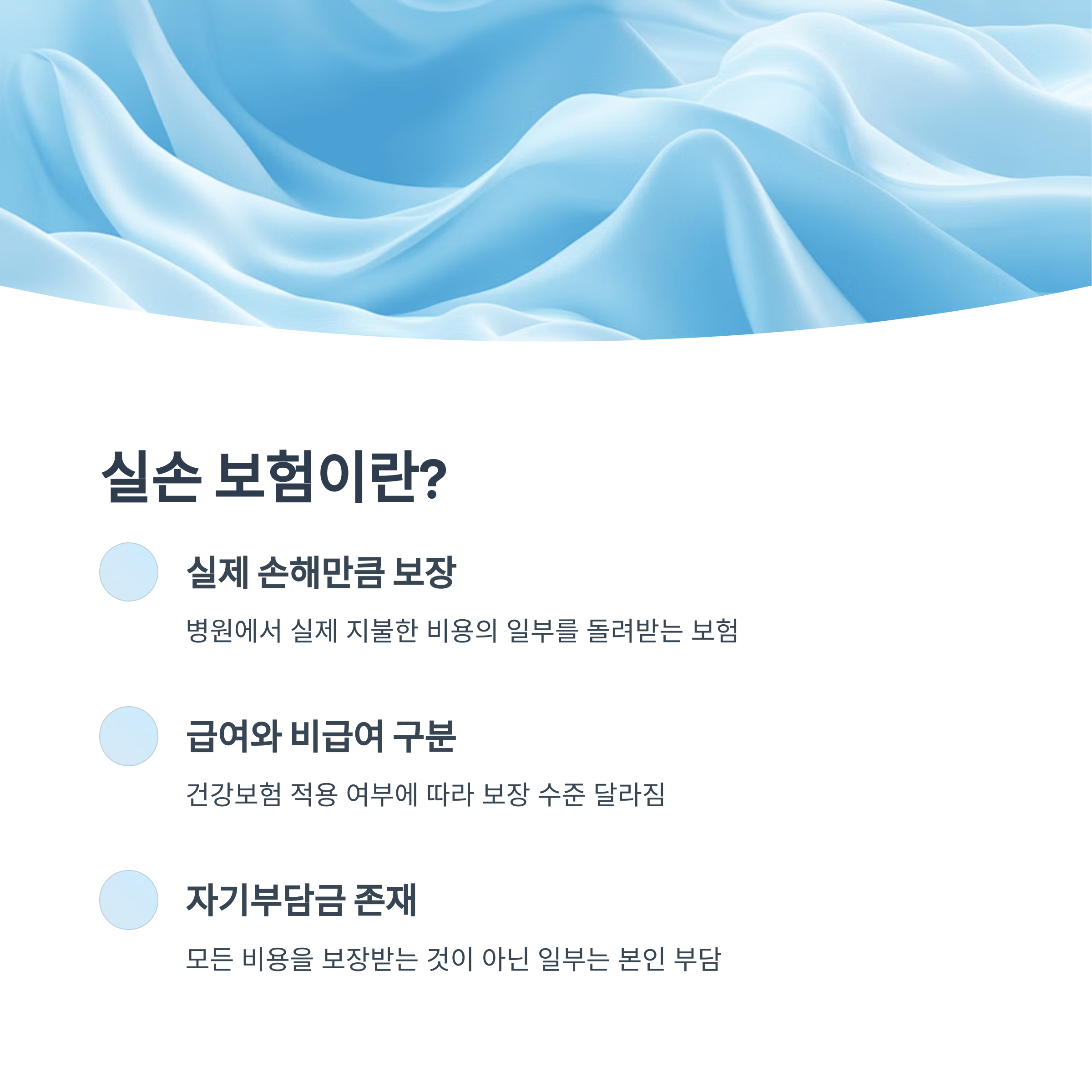 실손 보험은 쉽게 말하면 병원 치료를 받은 후 실제로 내가 낸 비용의 일부를 돌려받을 수 있는 보험이에요. 그래서 이름도 '실손'이에요. 즉, 실제 손해만큼 보장받는 구조죠. 예를 들어 병원비가 10만 원 나왔다면, 이 중 일정 금액을 제외하고 보험사에서 일부를 돌려주는 식이에요.
