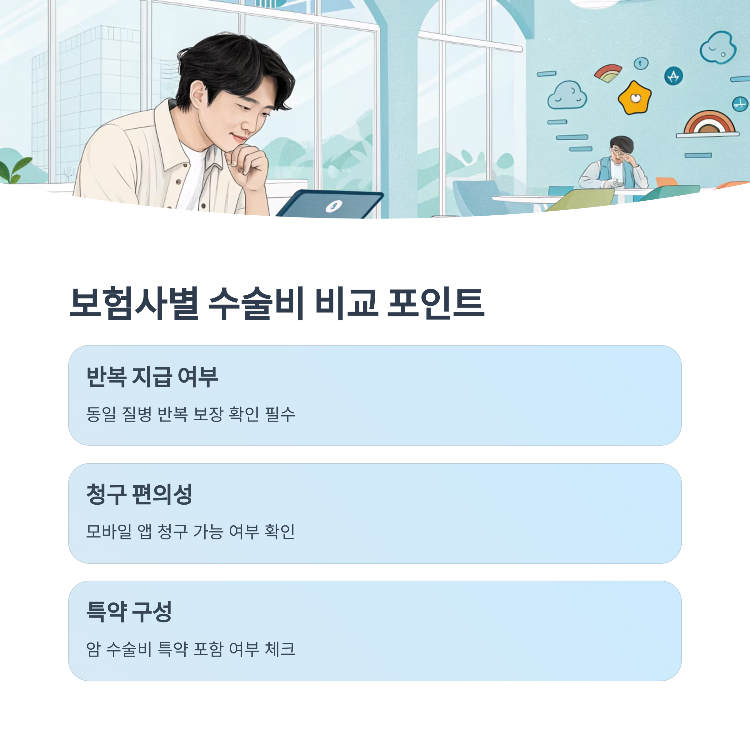 특히 암 수술비 특약은 1회성인지, 반복 지급이 가능한지 여부가 핵심이에요. 반복 지급이 가능하면 장기 치료 시 큰 혜택을 받을 수 있어요. 약관상 ‘동일 질병 반복 보장’ 여부 꼭 체크해야 해요.