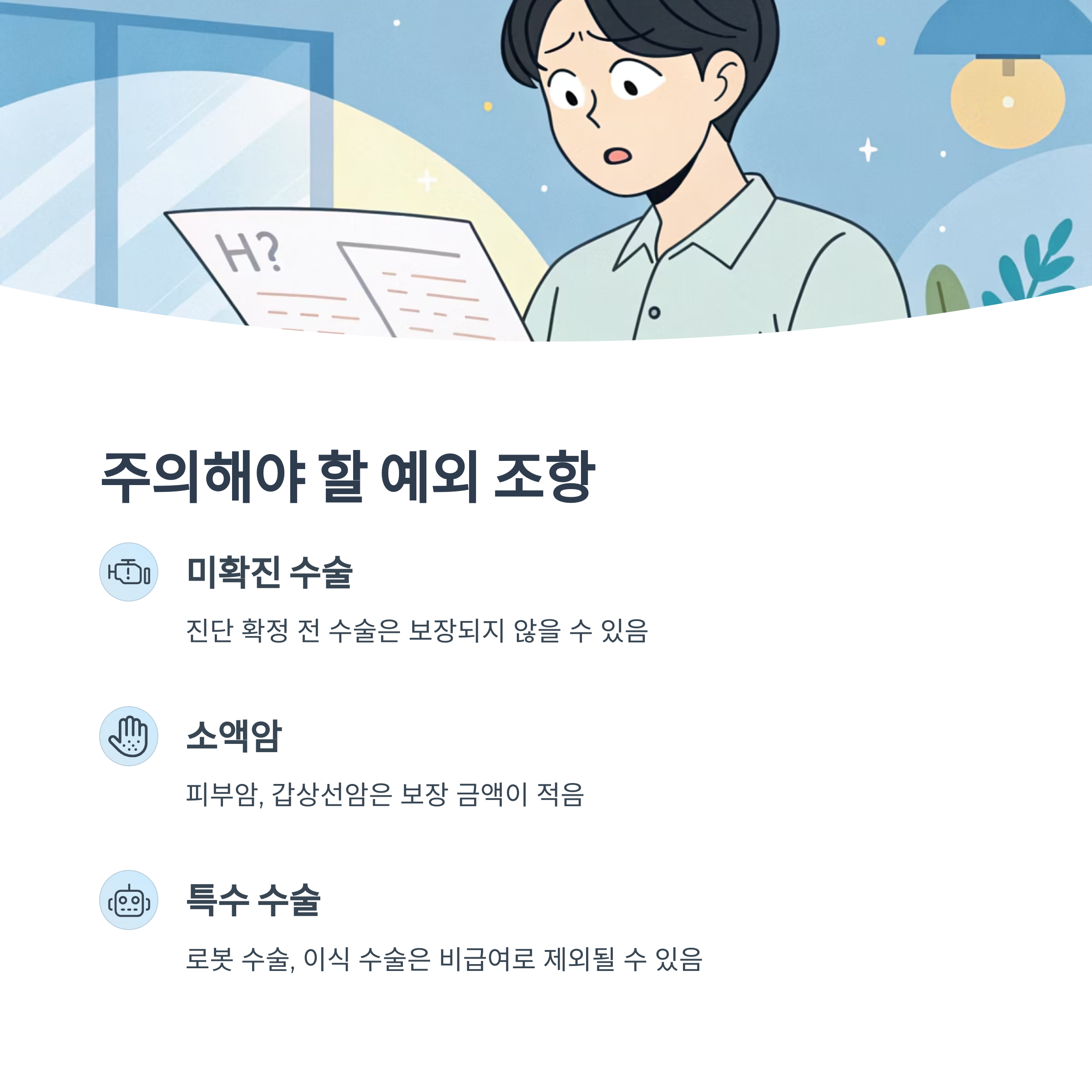 모든 암 수술이 다 보장되는 건 아니에요. 약관에 따라 ‘보장하지 않는 사유’가 명시돼 있어요. 예를 들어, 미확진 상태에서 진행한 수