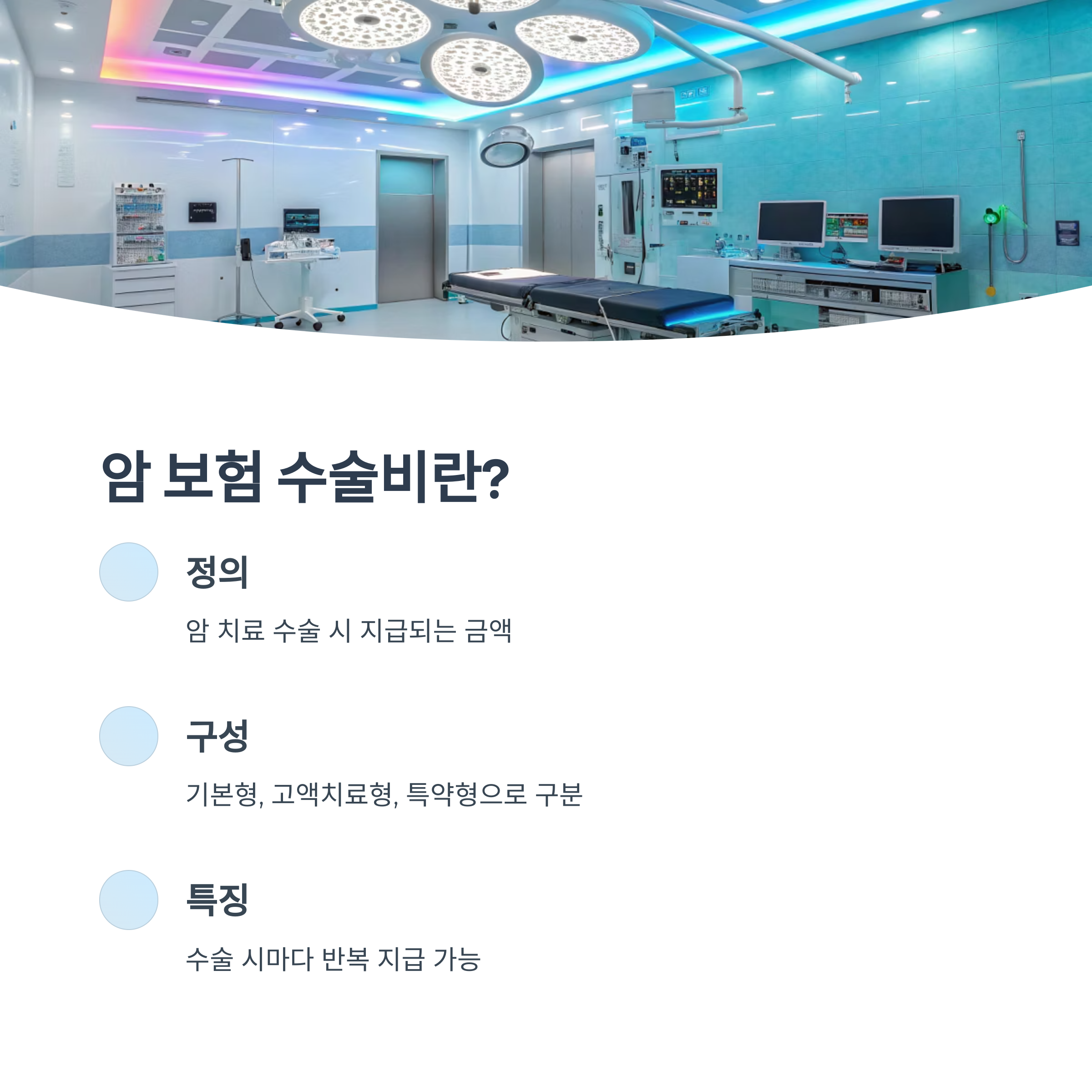 암 보험에서 수술비란 말 그대로 암을 치료하기 위한 수술을 받았을 때 지급되는 금액이에요. 이는 단순히 입원이나 진단금과는 다른 개념으로, 수술이라는 의료행위가 실제로 이뤄졌을 때 지급돼요.