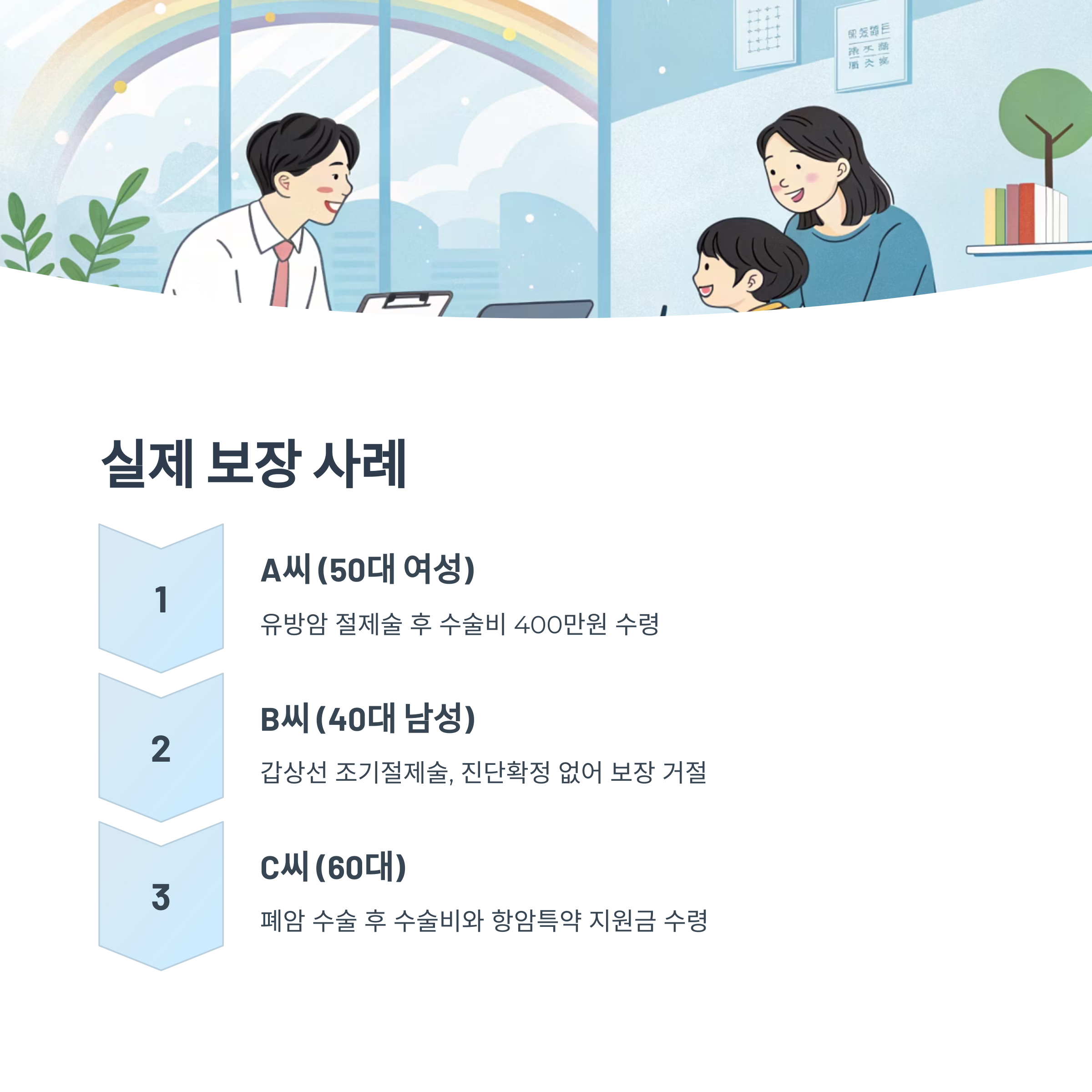 실제 사례를 보면 더 명확해요. 50대 여성 A씨는 유방암 진단 후 절제술을 받고 수술비 400만 원을 받았어요. A씨는 진단금 2000만 원과 수술비를 각각 받았기에 큰 도움을 받았다고 해요.