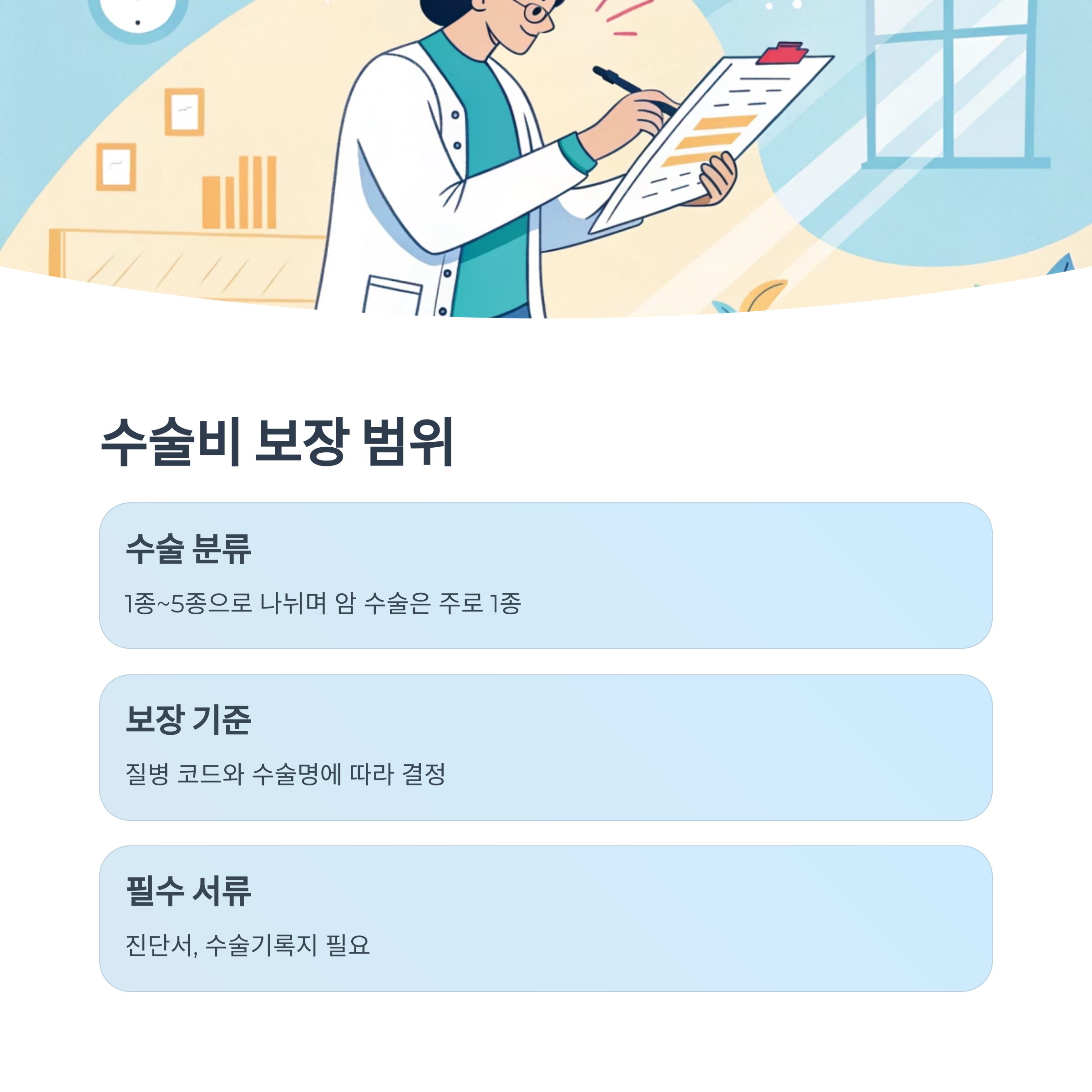 예를 들어 유방암 절제술, 대장암 수술, 폐암 절제수술 등은 비교적 고가의 수술로 분류되기 때문에 수술비도 높게 보장되는 구조로 설정돼요. 최근에는 로봇수술이나 복강경 수술도 포함되는 경우가 있어요.