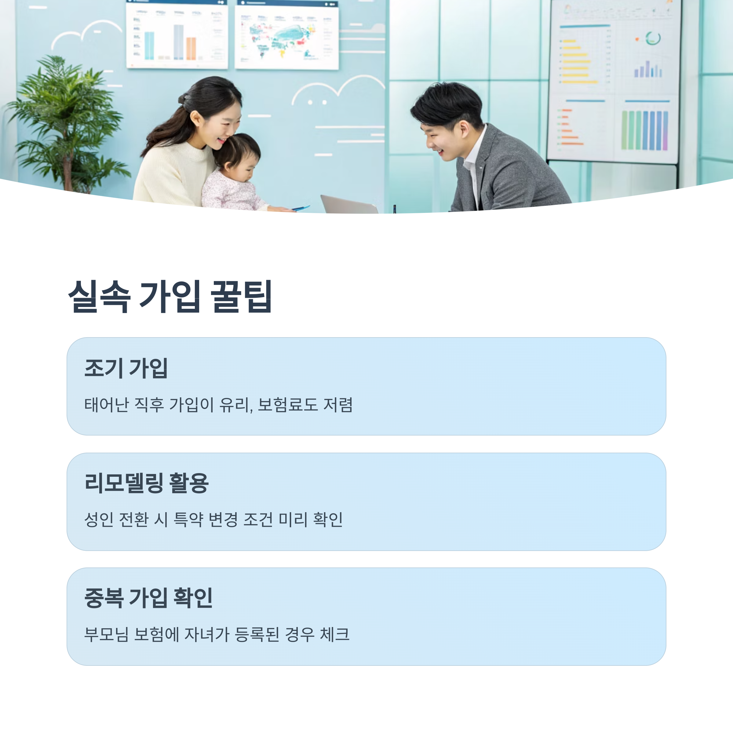 첫 번째 꿀팁은 아이가 태어난 직후 가능한 빠르게 가입하는 거예요. 어릴수록 병원 방문 기록이 적어서 보험 심사에 유리하고, 보험료도 저렴하답니다.