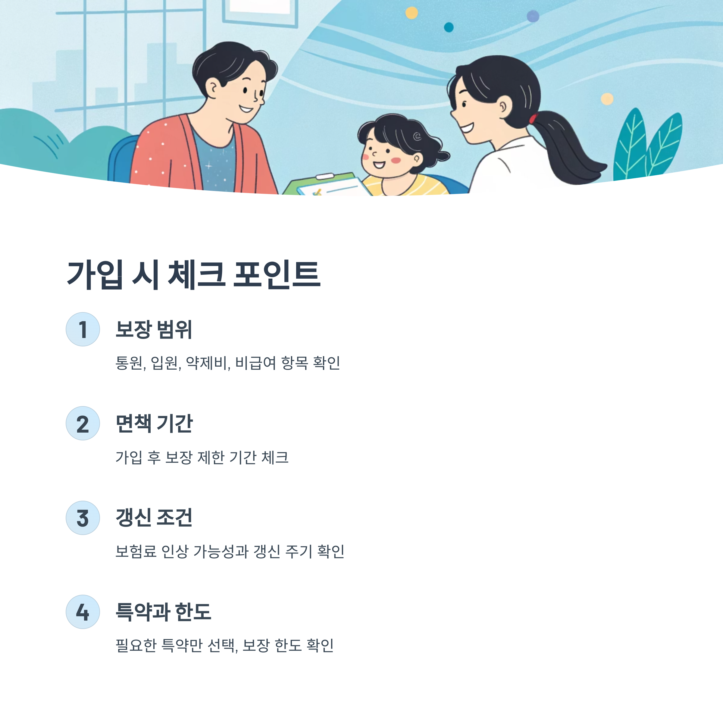 셋째는 갱신 조건과 갱신 주기예요. 어린이 실손 보험 대부분은 매년 갱신되는데, 갱신 시 보험료가 오를 수 있어요. 과거 치료 이력에 따라 갱신 거절이 되기도 하니 꼭 체크해요.