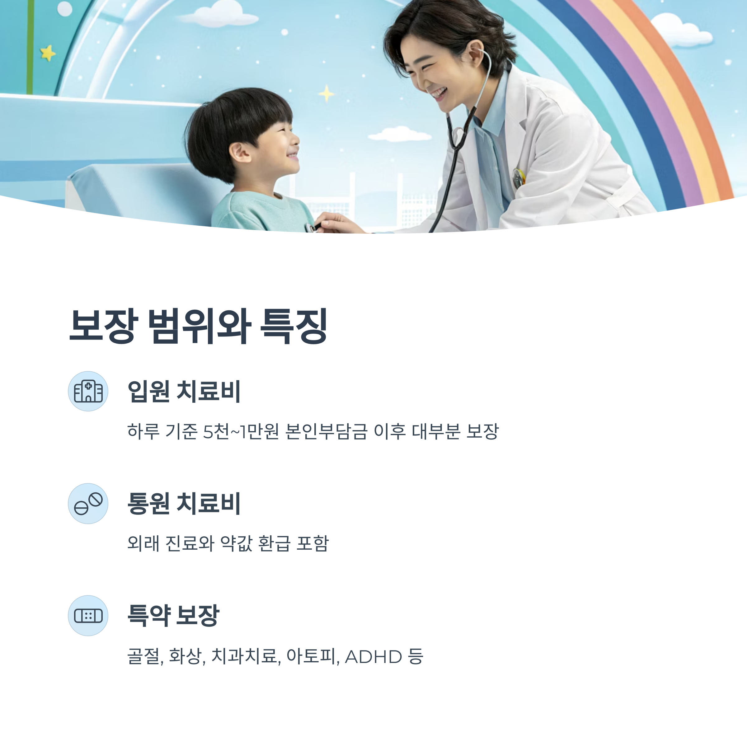 어린이 실손 보험의 가장 큰 매력은 다양한 보장 범위에 있어요. 기본적으로 입원 치료비와 통원 치료비가 모두 보장되며, 약값도 일부 환급 받을 수 있어요. 특히 입원 시 하루 기준 5천 원~1만 원의 본인부담금 이후 발생하는 금액은 대부분 보장돼요.