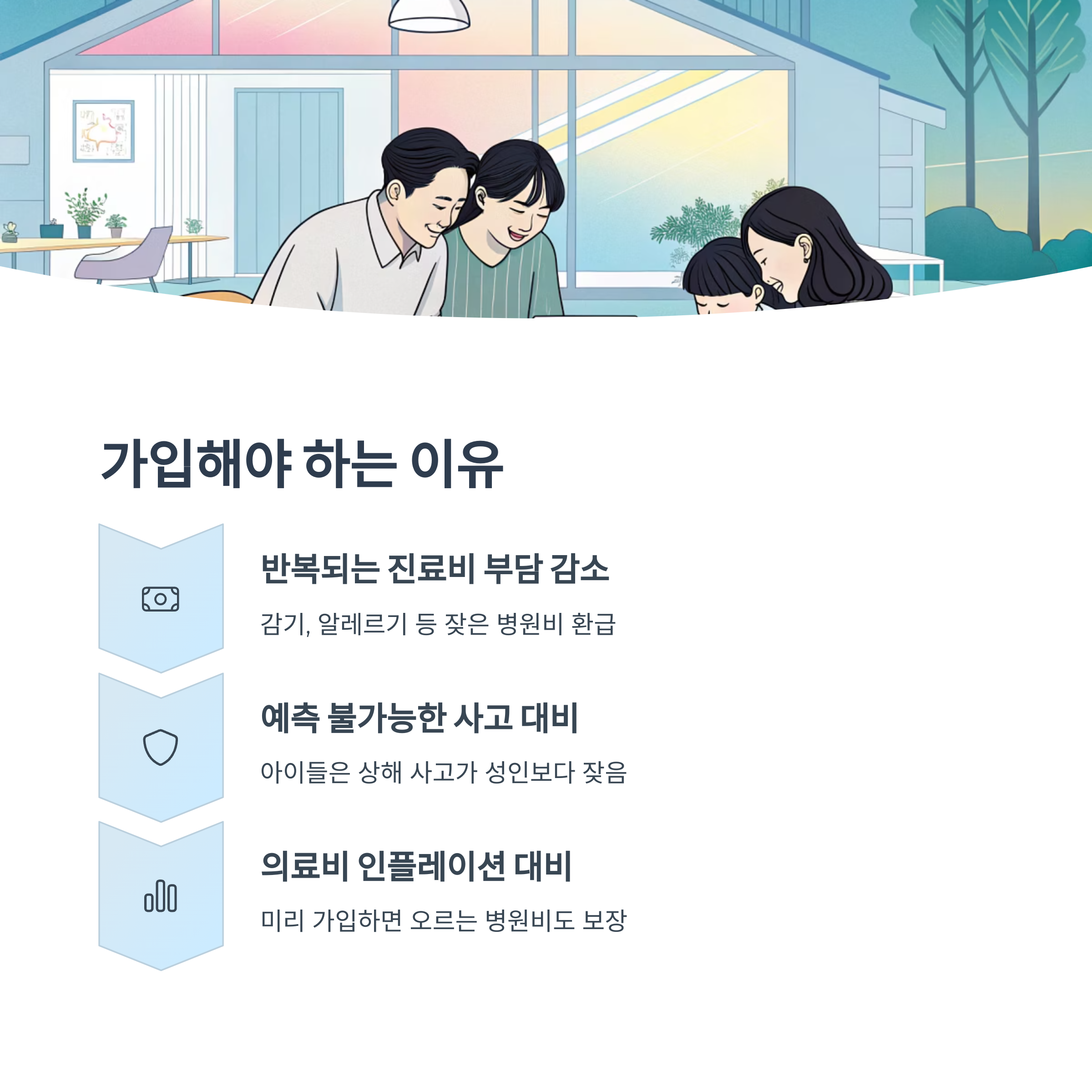 무엇보다 중요한 건 '의료비 인플레이션'이에요. 해마다 병원비가 오르고 있거든요. 실손 보험은 지금 가입해두면 나중에 오른 병원비도 기준 이상 보장받을 수 있어요. 그래서 어릴 때일수록 빨리 가입하는 게 유리해요.