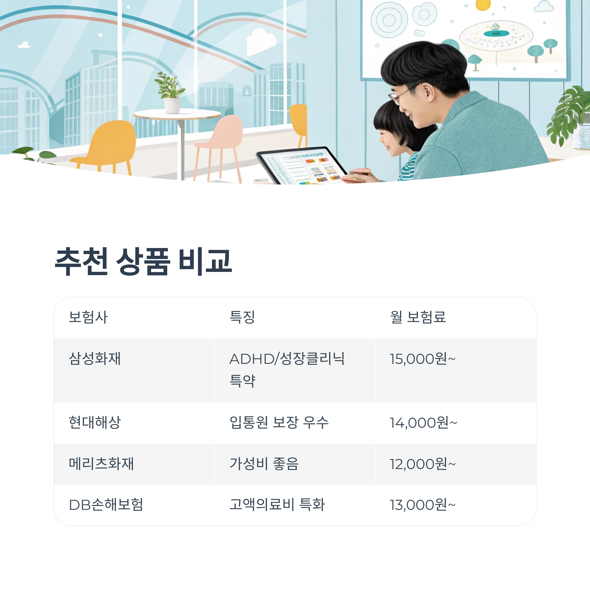 보장 항목으로는 골절, 화상, 깁스, 치과치료, 시력교정 등도 선택 가능하고, 특정 보험사에서는 아토피, ADHD, 성장클리닉 치료도 특약으로 보장이 돼요. 특히 요즘 ADHD 관련 치료나 언어치료 등 심리치료 항목을 보장하는 상품도 있어 실용적이에요.