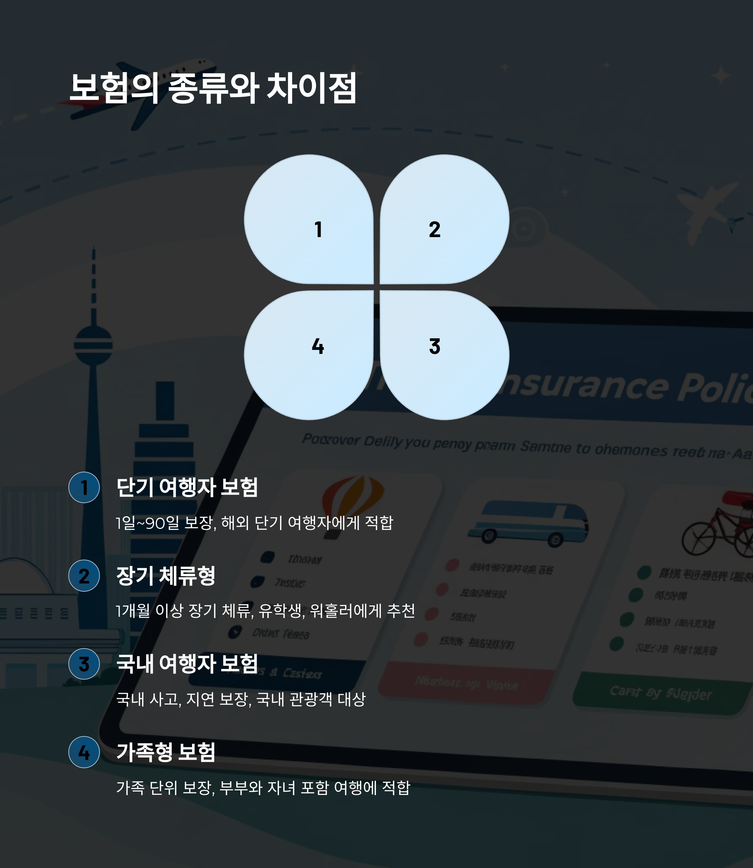 이처럼 보험은 종류에 따라 특징과 보장 범위가 전혀 달라요. 여행 목적과 동행자에 맞게 선택하는 것이 핵심이에요! ✅