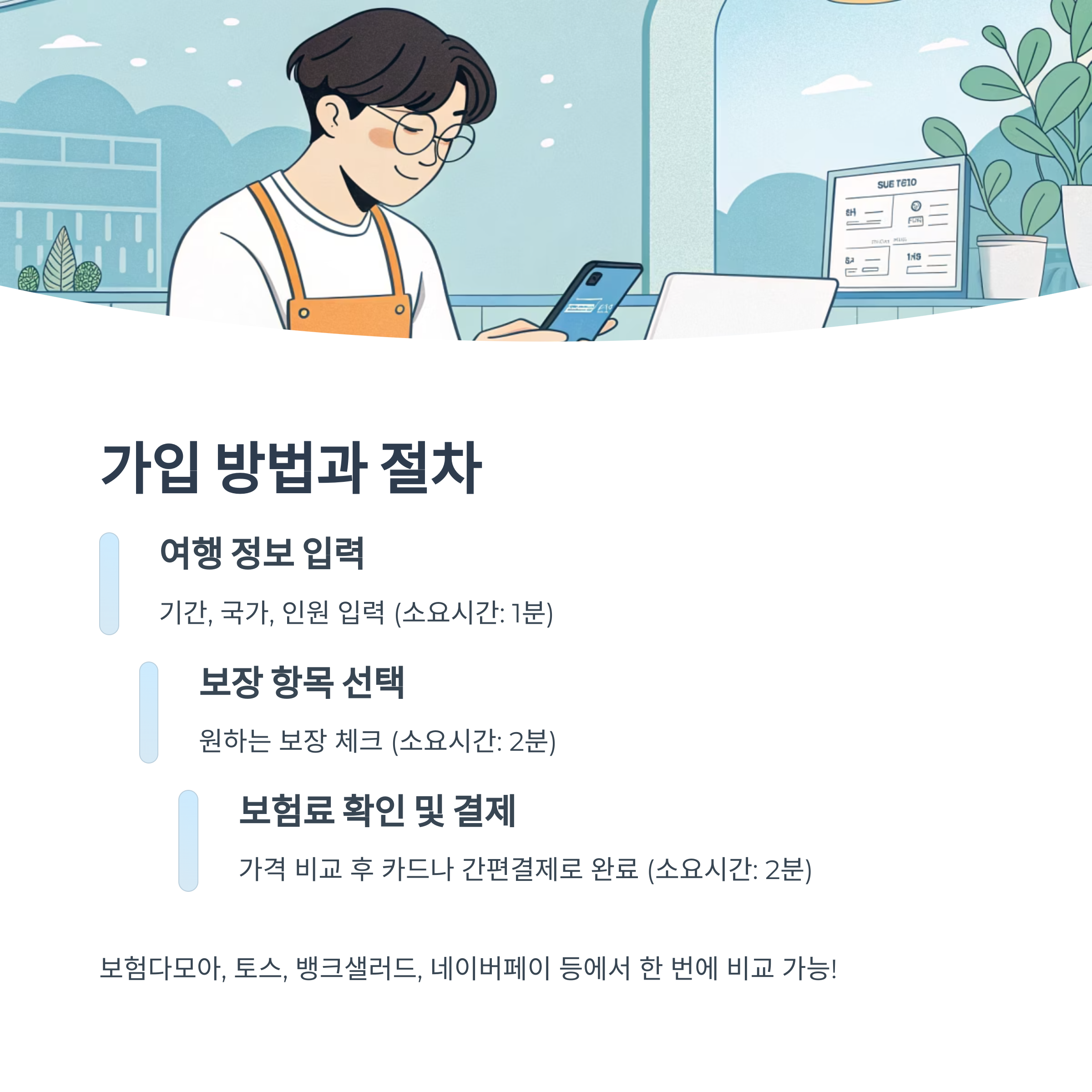 우선 첫 단계는 어떤 여행을 갈지, 여행 기간과 목적지를 정하는 거예요. 그다음엔 여러 보험사의 여행자 보험 상품을 비교해보는 게 중요해요. 보험다모아, 토스, 뱅크샐러드, 네이버페이 등에서 한 번에 비교가 가능하니 적극 활용해보세요.