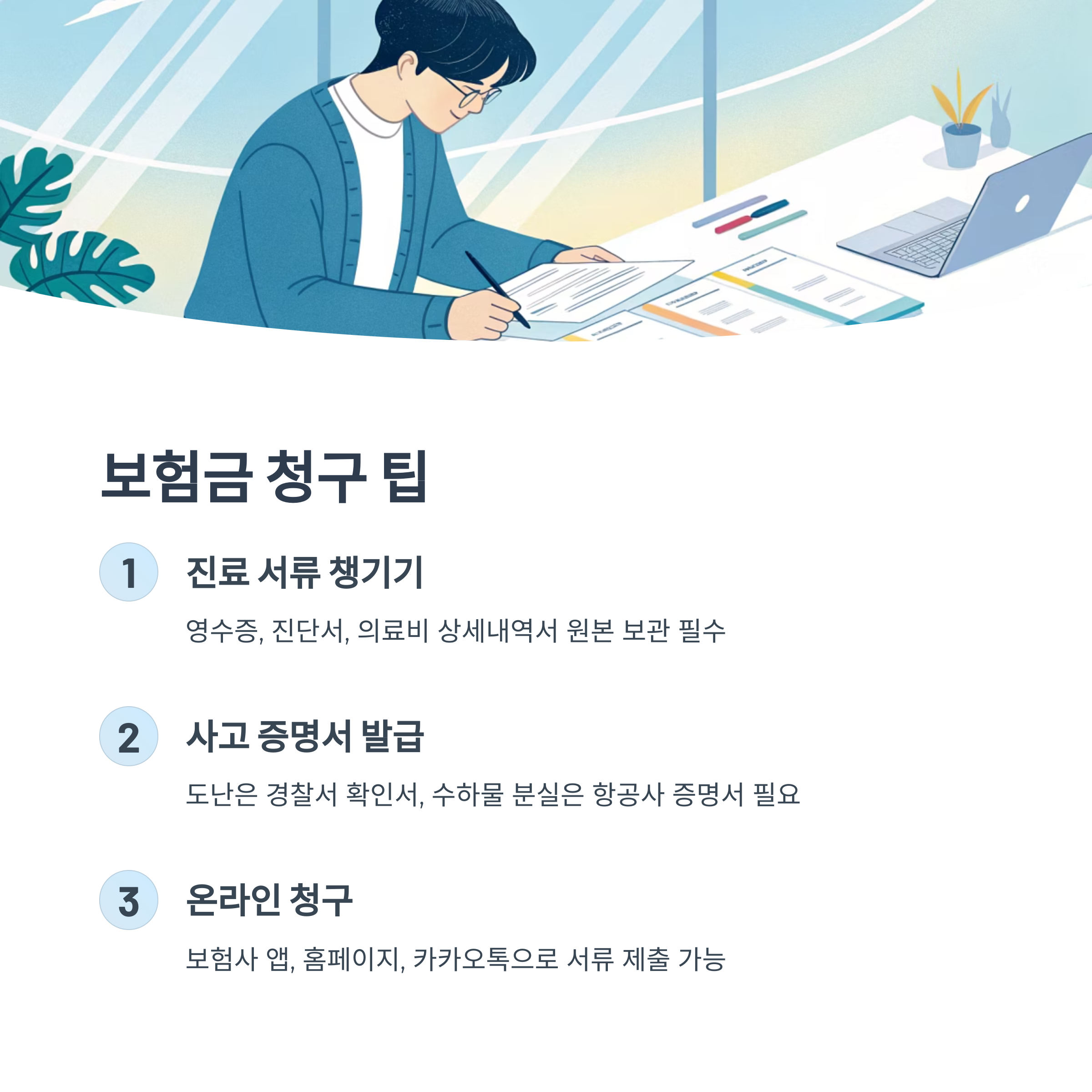 보험금 청구는 까다롭지 않지만, ‘꼼꼼함’이 필요해요. 사고가 난 순간부터 증빙 자료를 하나씩 챙기는 습관이 있다면, 보험금 수령까지 걱정 없답니다! 🧾