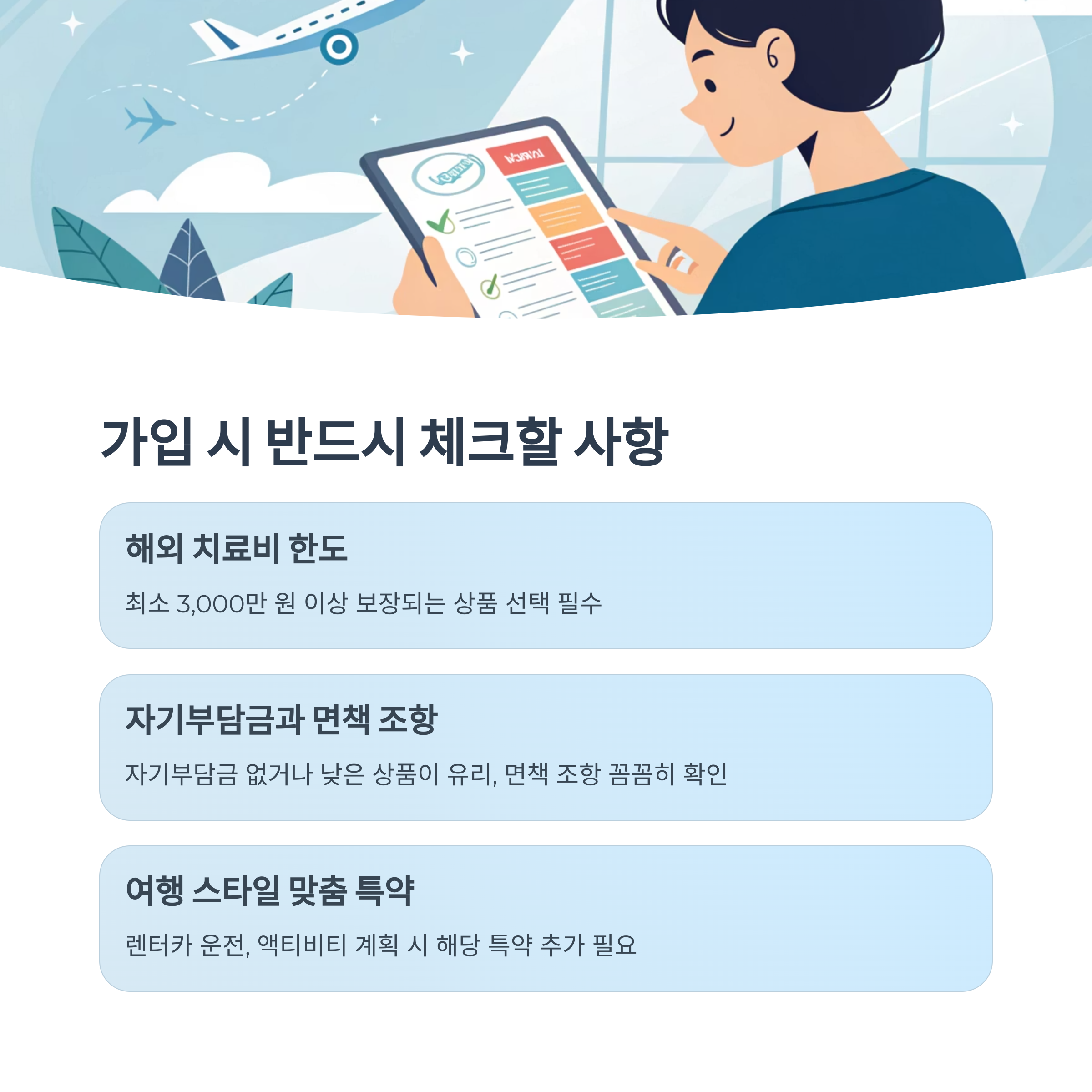 | 특약 | 여행 형태 맞춤 보장 | 운전, 액티비티 여부 확인 |